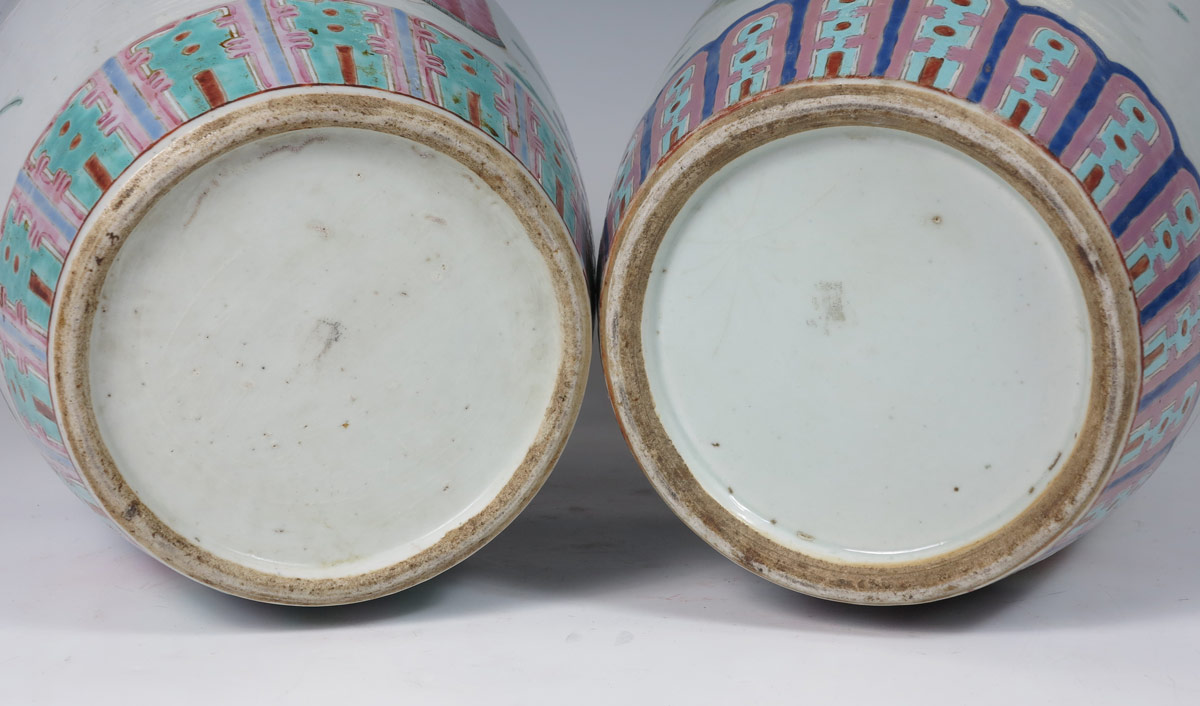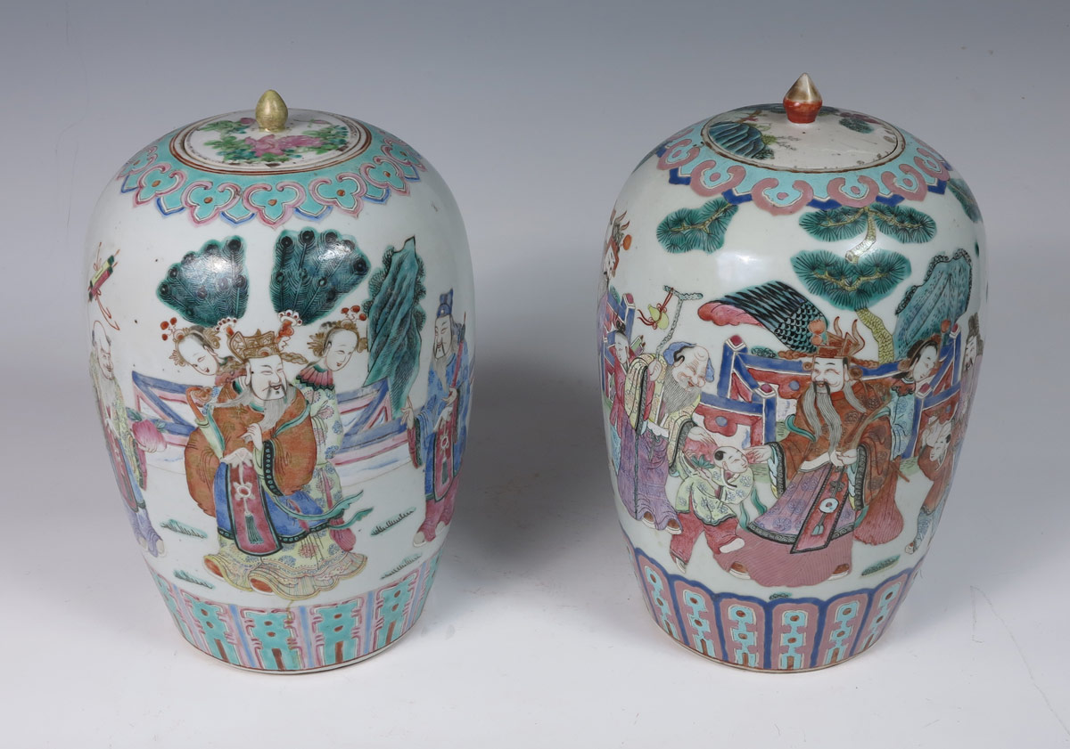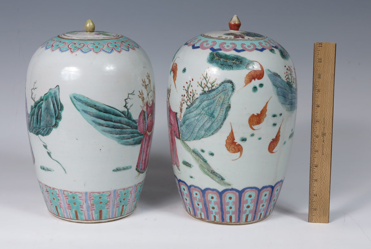 TWO CHINESE COVERED JARS/VASES: Polychrome decoration depicting what appears to be a celebratory procession. One lid is adhered to jar. Measures 13'' tall. Sold with carved wood stands.