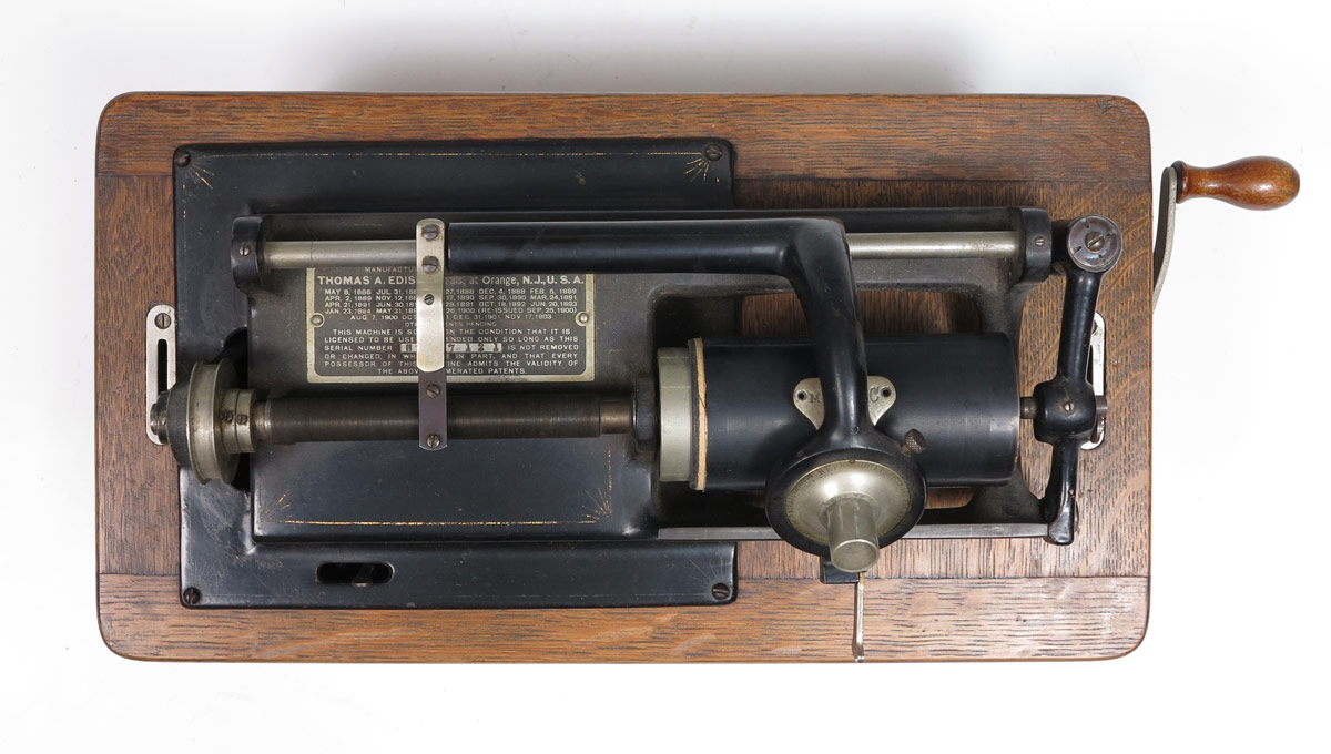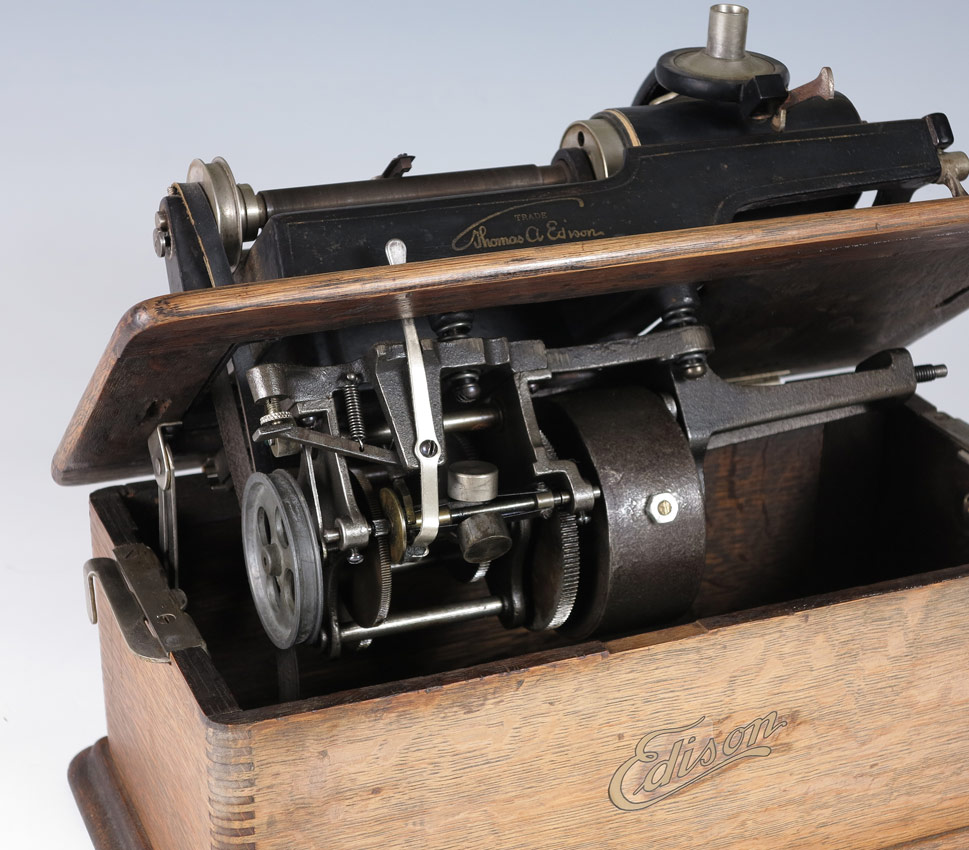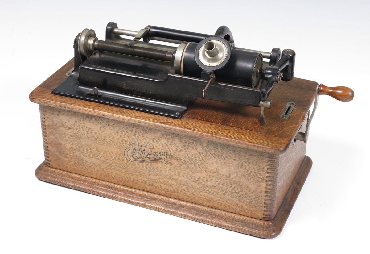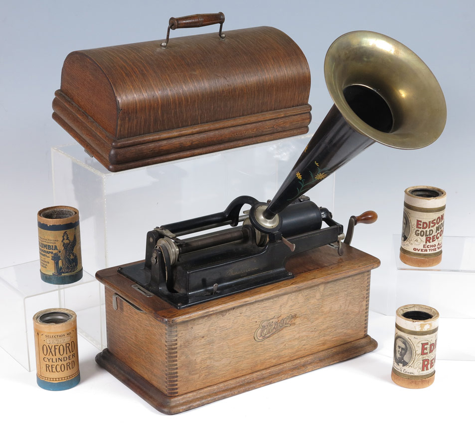 EDISON HOME CYLINDER PHONOGRAPH: Golden oak case, replacement Edison decal on front. Serial number B227121, last patent date of 1903. Model C reproducer. Overall 13'' h. x 16 1/2'' x 9 3/4''. Sold with horn with hand painted floral decoration, 14'' l. x 7 1/4''. Also sold with 5 rolls.
