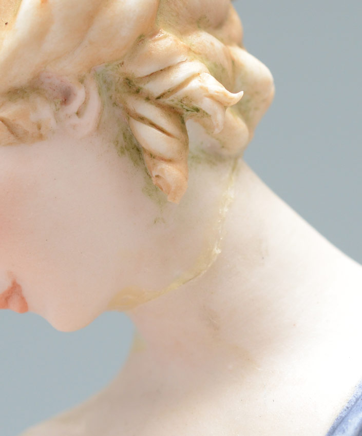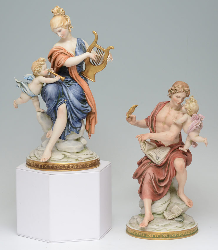 PAIR GUISEPPE CAPPE ITALIAN PORCELAIN FIGURINES: Each with a cupid. Measures approx. 9'' x 6'', signed, stamp on bottom reads G Calle Works of art Italy 99046 and 99045.