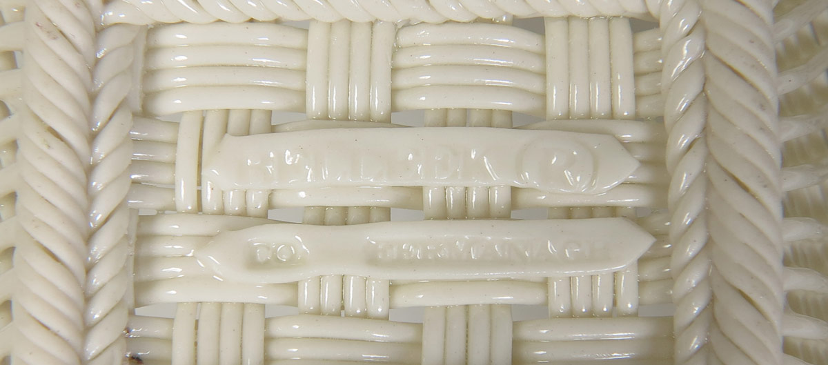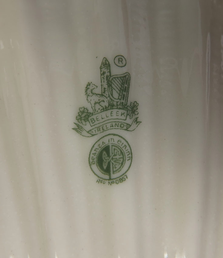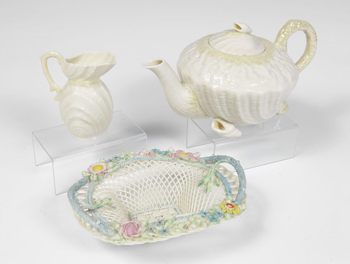 3 PIECE BELLEEK PORCELAIN COLLECTION: 3 pieces to include 1) Shell form teapot, shell finial and shell front feet. Green mark, 5 3/4'' h. x 9 3/4''. 2) Shell form open creamer. Green mark, 4 1/4'' h. x 4''. 3) Reticulated basket with applied flowers, unmarked. 2 5/8'' h. x 7 3/4'' x 6 3/4''.