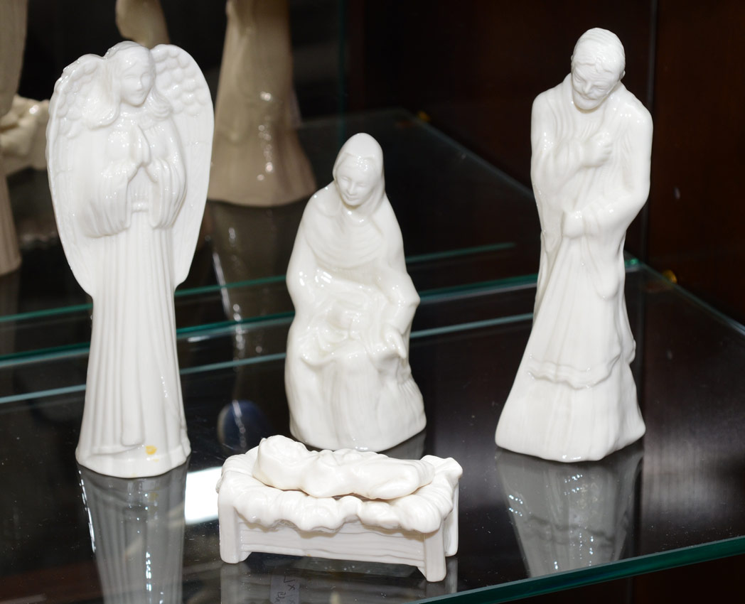 5 BELLEEK NATIVITY FIGURINES: All with black Belleek 10th mark. Mary 2003 sticker, Joseph 2004 sticker, Jesus and hay filled crib, and an Angel 7 7/8''h.