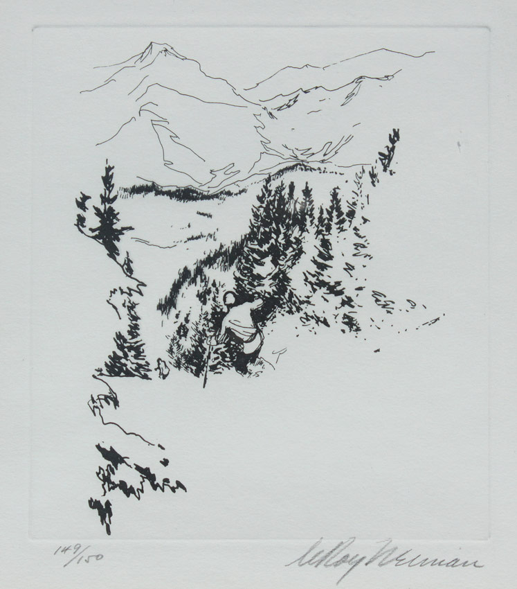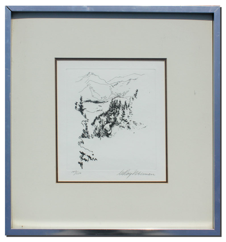 NEIMAN, Leroy, (American, 1921-2012): Skiers in a Landscape, Etching, Sight size 9 3/4'' x 8 3/4'', pencil signed lower right, #'d lower left 149/150, encased in worn metal frame 18 3/4'' x 17 3/4''.