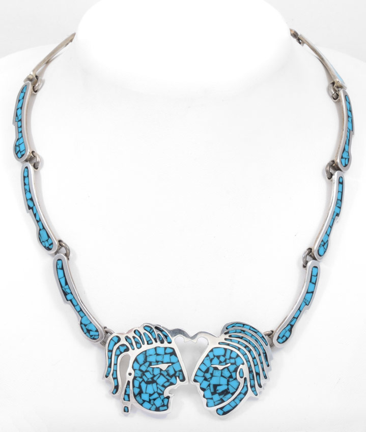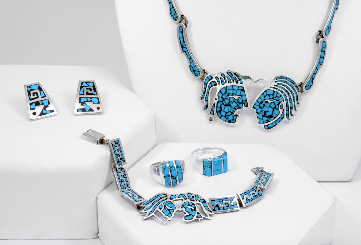 MEXICAN STERLING JEWELRY: Five inlaid turquoise on sterling pieces, all marked Mexico 925, to include, two size 11 rings; Aztec warrior motif suite - 19'' necklace, 7'' bracelet and 1'' earrings, necklace with added TC-107 mark. Overall 5.22 Troy Oz including stones.