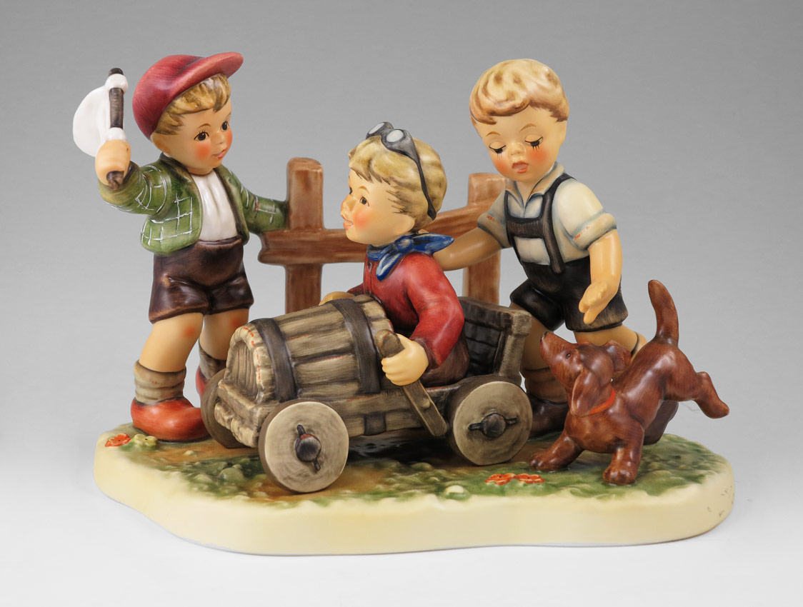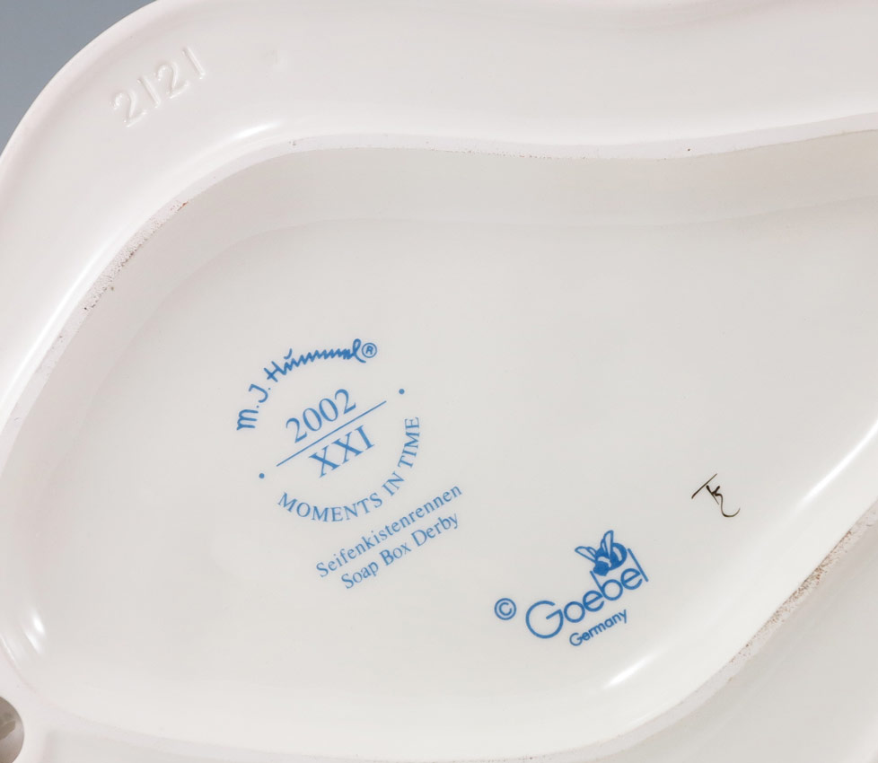 HUMMEL PORCELAIN ''SOAP BOX DERBY'' GROUP FIGURINE, MOMENTS IN TIME COLLECTION: #2121, 2002 M.I. Hummel Club piece, current Goebel Mark, approx. 6 1/2''h. x 9 1/2'' x 6 1/2''