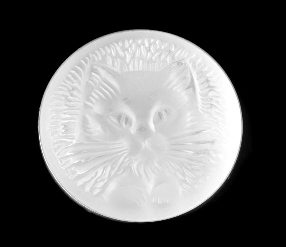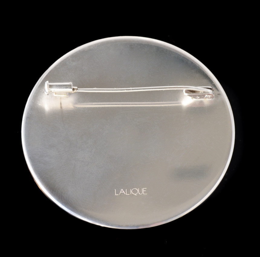 LALIQUE FRENCH CRYSTAL PIN: Designed by Marie Claude. Frosted crystal with a silver tone metal backing. Diam. 1.75''. Impressed ''Lalique''.