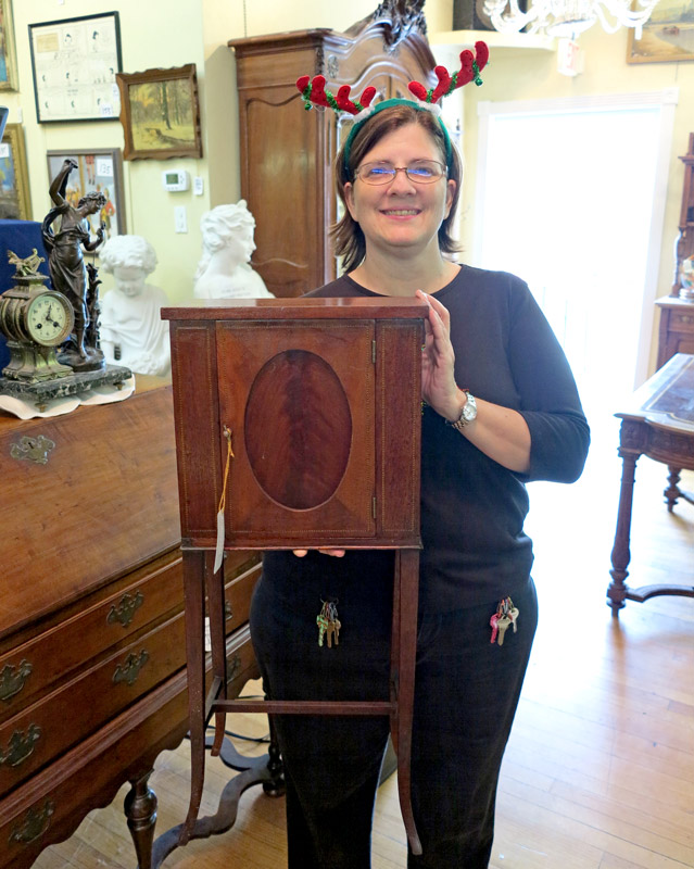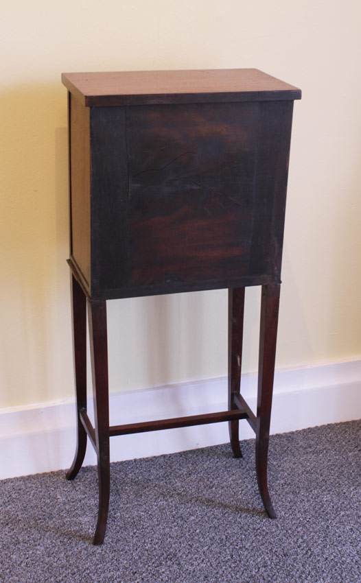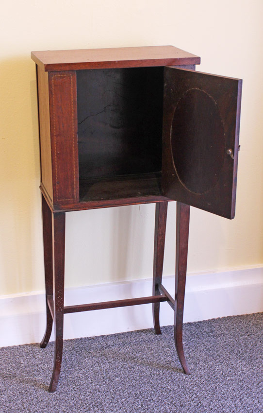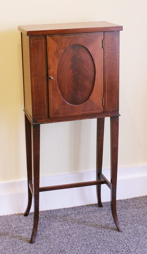 DIMINTIVE HEPPLEWHITE STYLE STAND: Single door, rope twist inlay accents. Tapered splayed legs and stretcher in the manner of Hepplewhite. Measures 28'' h. x 12 3/4'' x 7 3/4''.