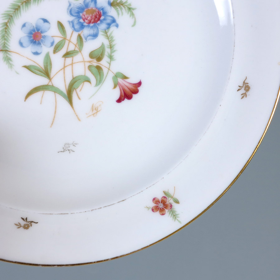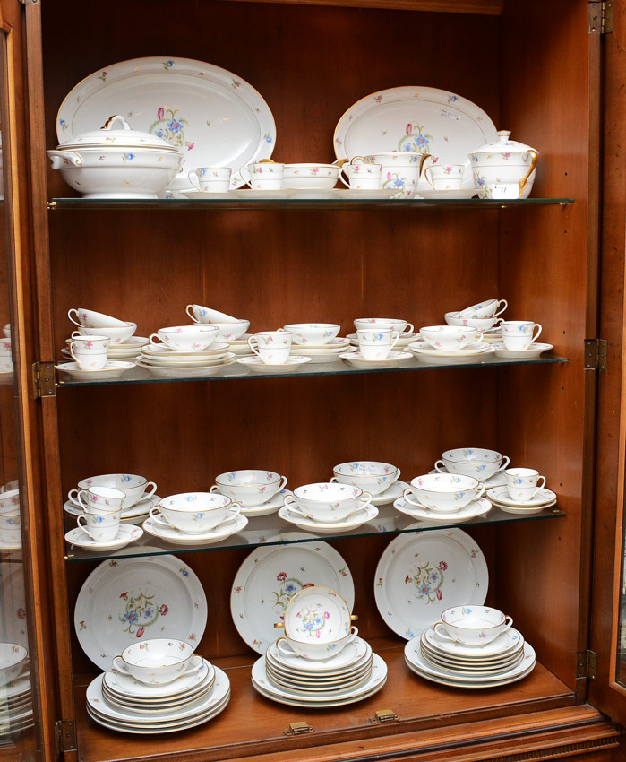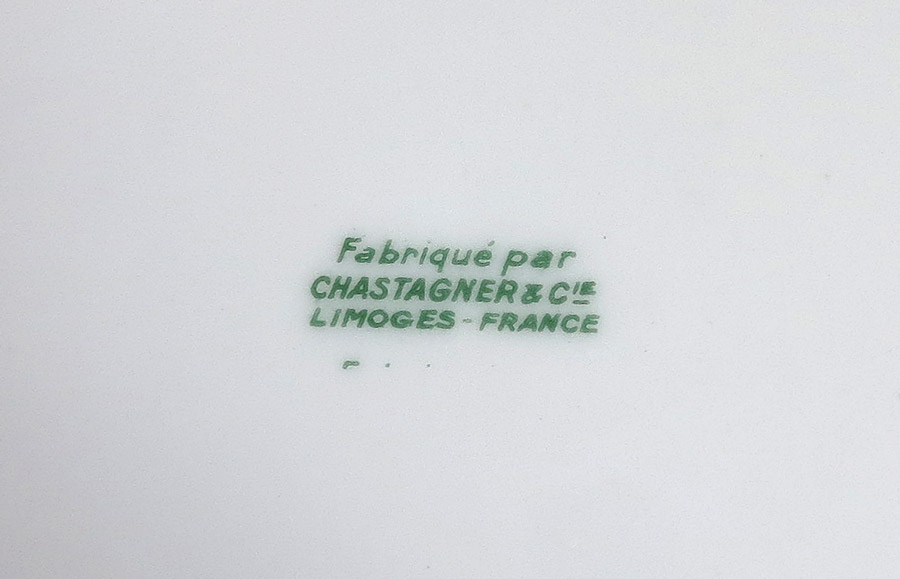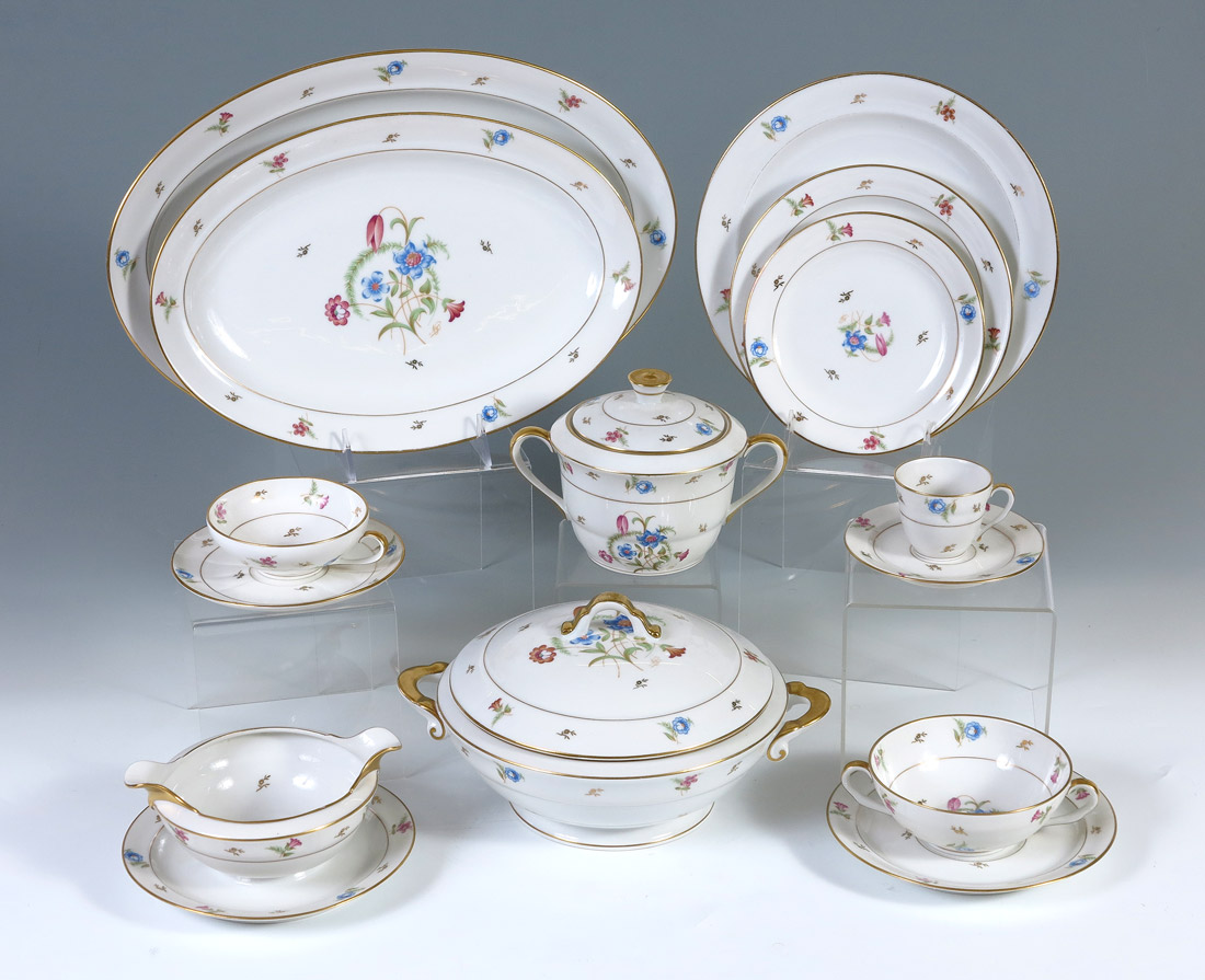 CHASTAGNER FRENCH LIMOGES FINE CHINA SERVICE FOR 10: Approx. 106 pieces to include 10 dinner plates, 12 salad plates, 11 bread plates, 11 cream soup with 12 saucers, 10 cups with 12 saucers, 11 demi-tasse cups with 11 saucers, creamer, sugar, covered vegetable, gravy, a 12 1/4'' platter and a 15 1/2'' platter.
