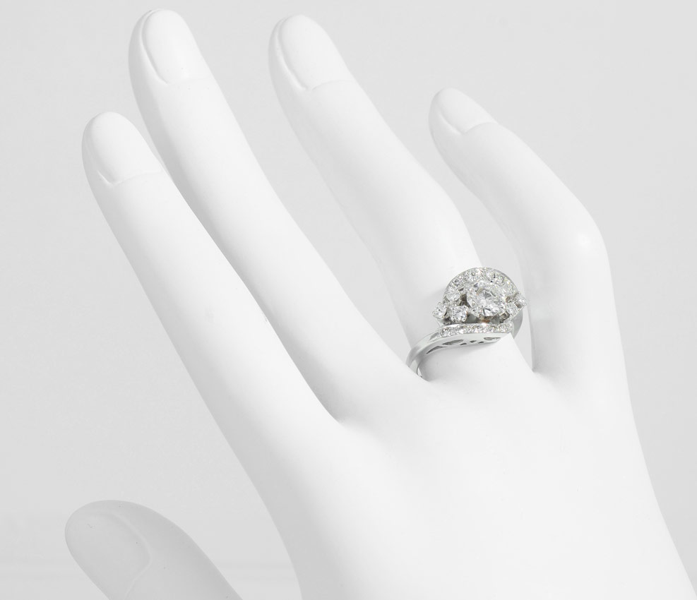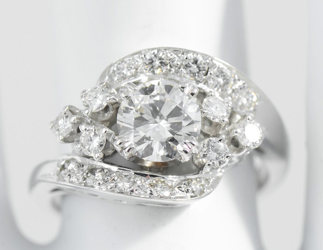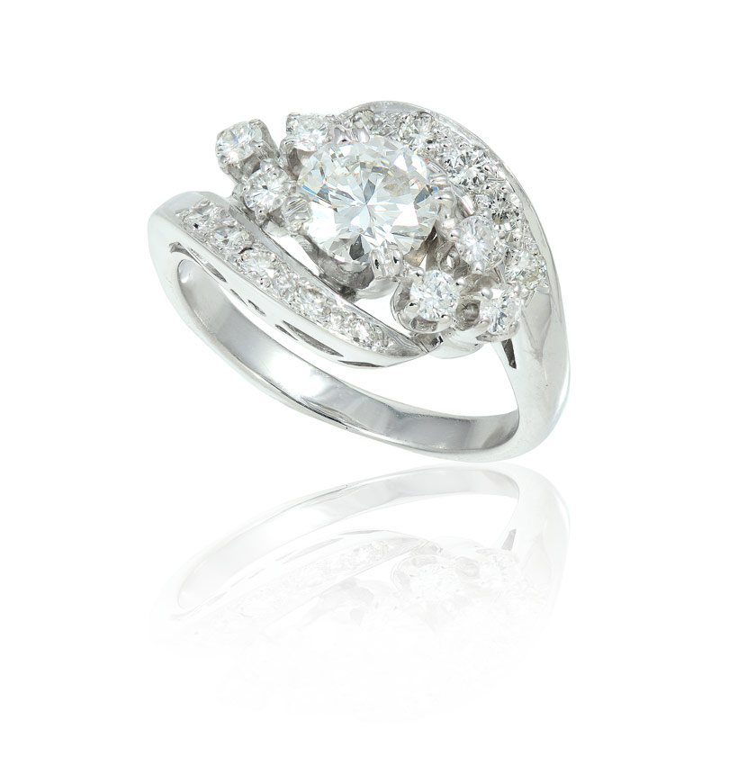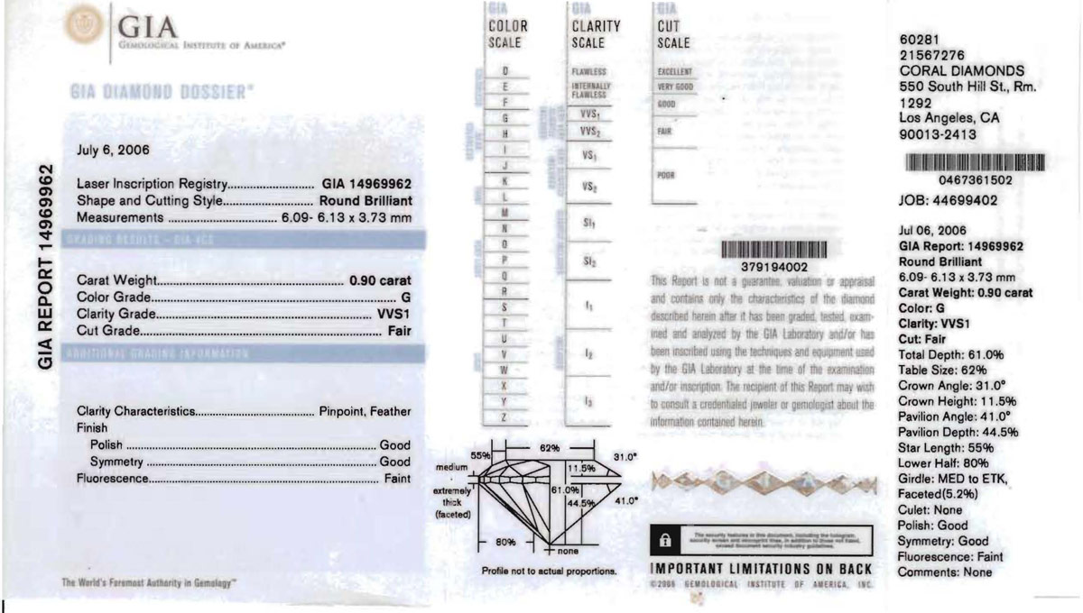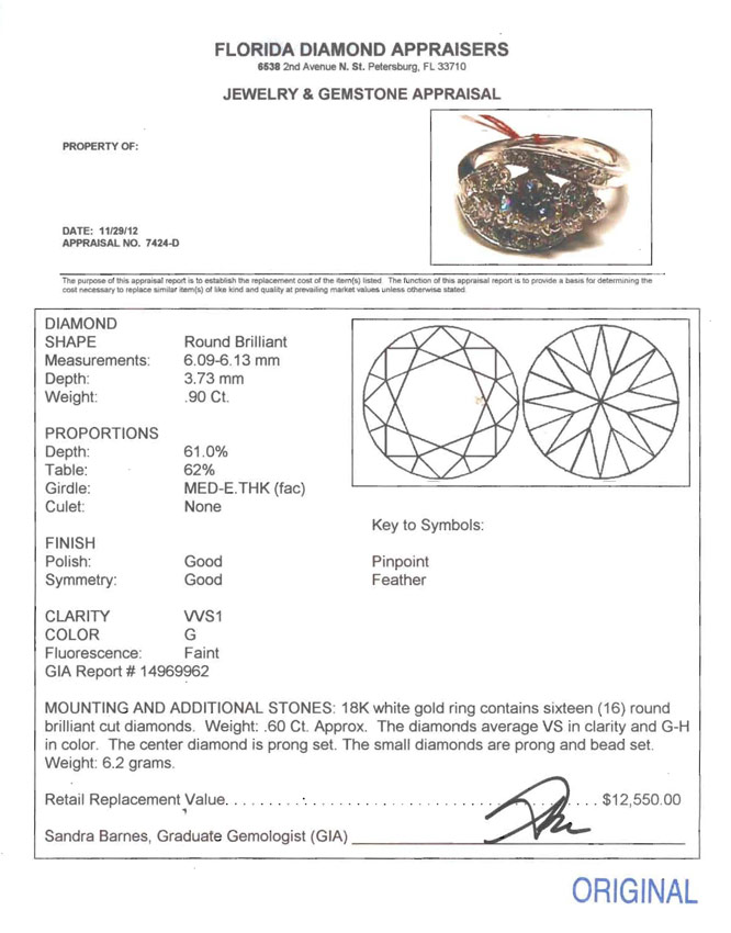 18K 1.50 CTW DIAMOND RING: 18K white gold ring centers GIA certified .90 Ct round brilliant cut diamond, rated VVS1 in clarity and G color. An additional 16 round brilliant diamonds total approx. .60 Ct.,average VS in clarity and G-H color. Size 6. Weight 6.2 grams. GIA report number 14969962. Sold with current Florida Diamond Appraisers GIA graduates appraisal for $12,550.