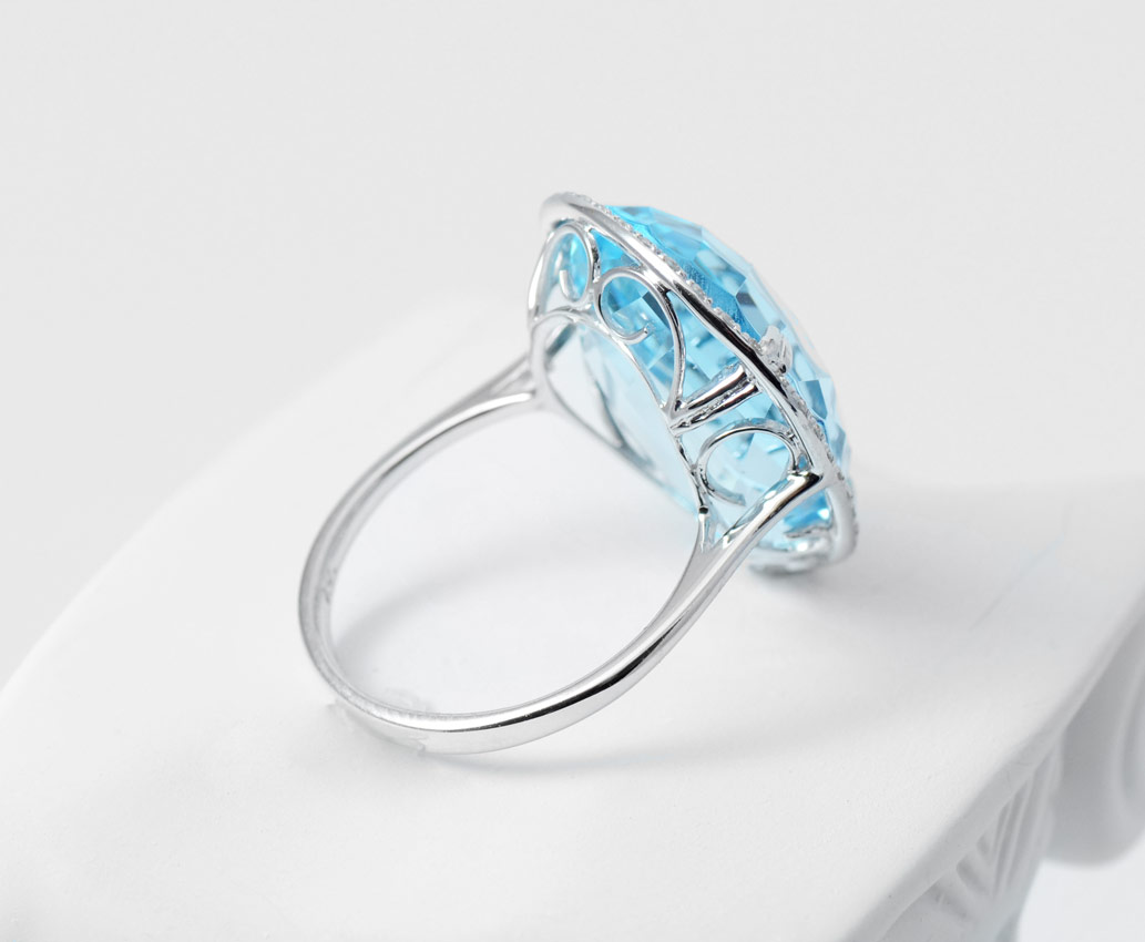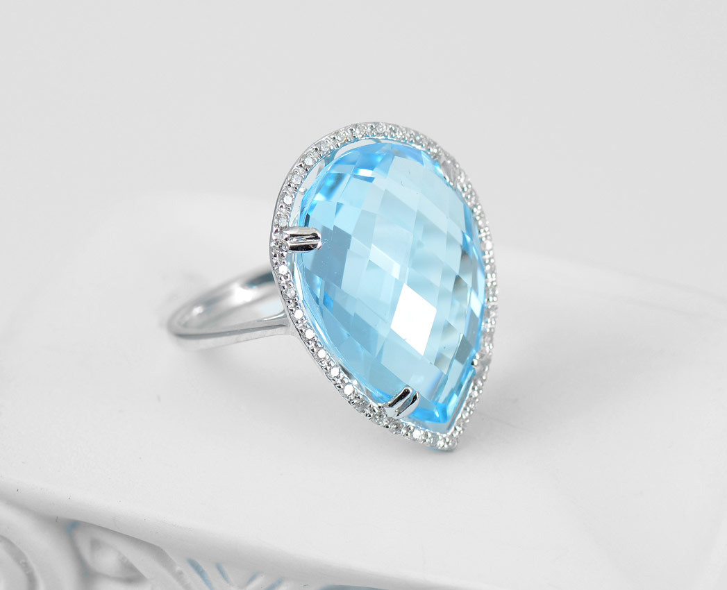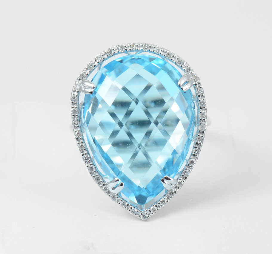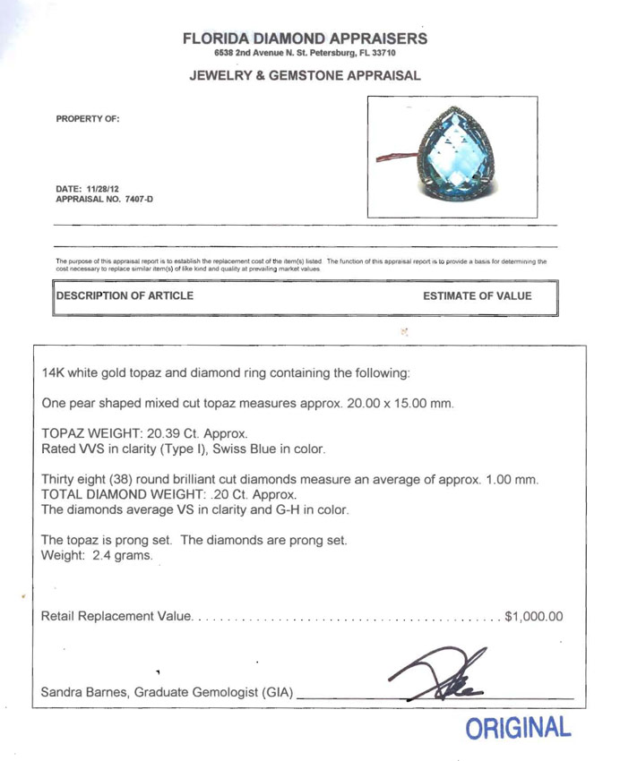 20.39 CT PEAR SHAPED BLUE TOPAZ & DIAMOND RING: 14K white gold ring centers an approx. 20.39 Ct blue topaz, VVS in clarity, Swiss blue in color. Framed by 38 round brilliant diamonds totaling .20 Ct., averaging VS in clarity and G-H color. Stones are prong set. Size 6.5. Weight 2.4 grams. Sold with current Florida Diamond Appraisers GIA graduates appraisal for $1000.