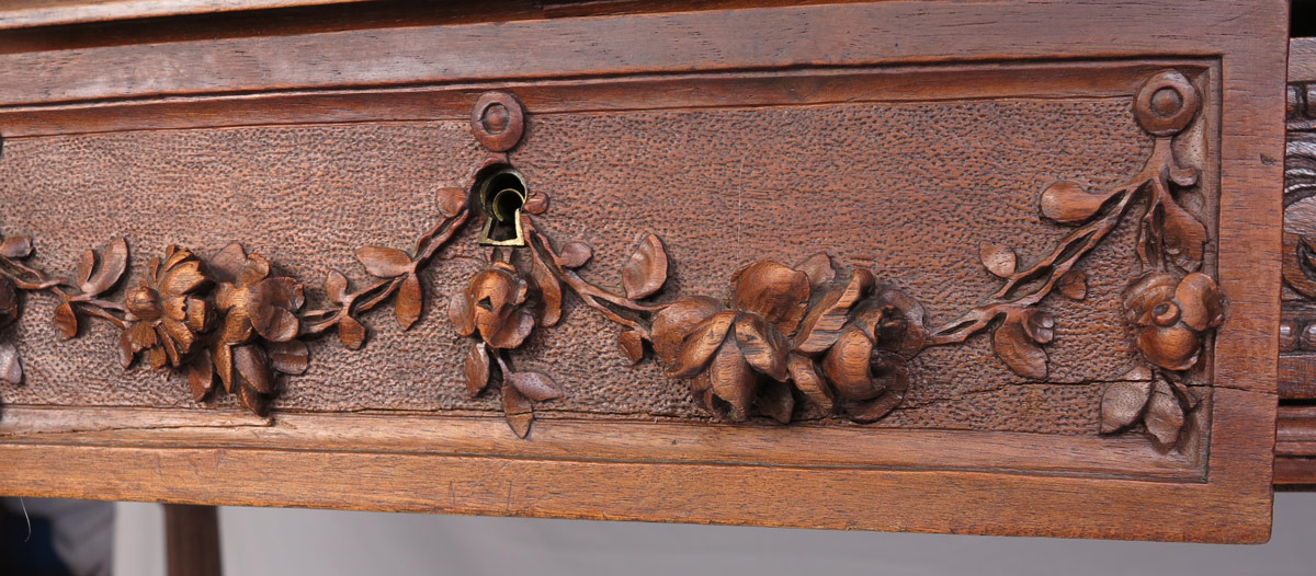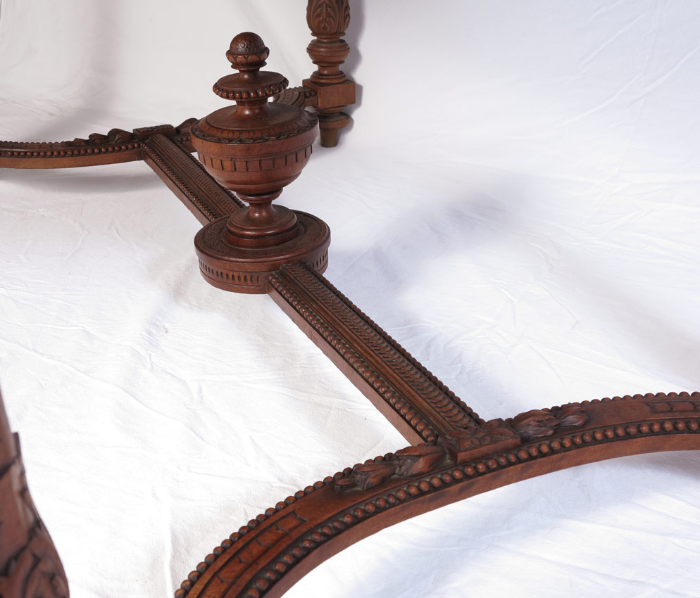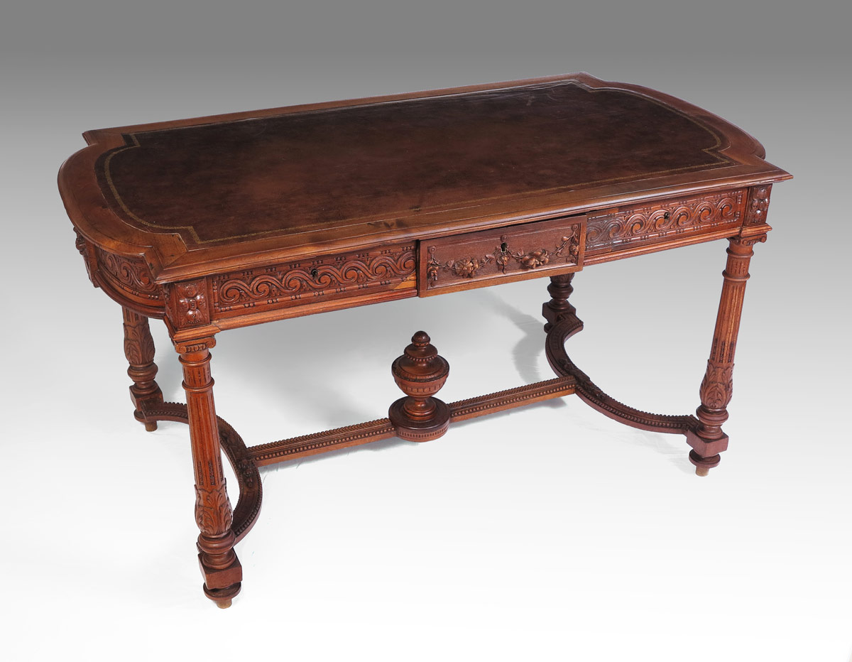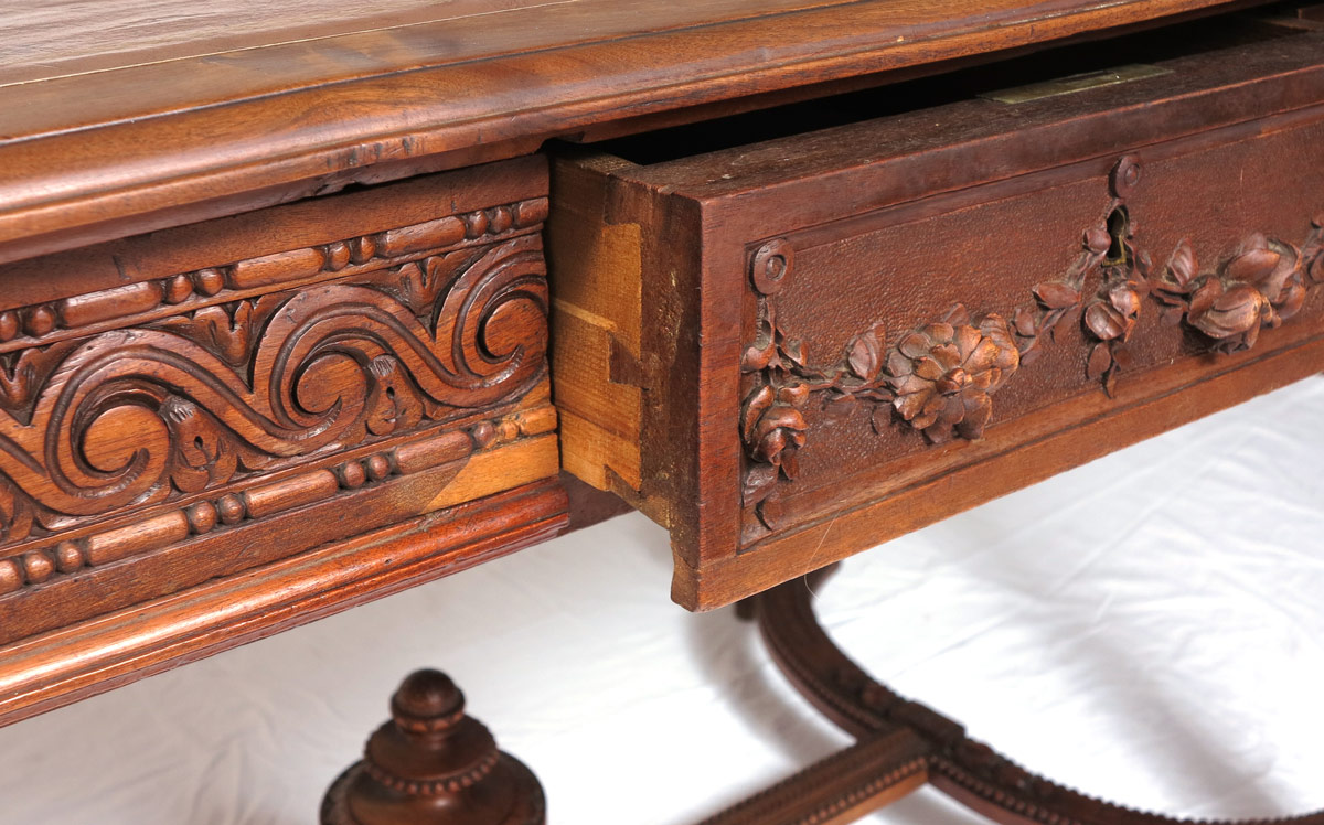 RICHLY CARVED 19th C WALNUT LIBRARY TABLE: 3 drawer desk with embossed leather writing surface, approx. 30 1/2''h. x 33 1/2'' x 59''