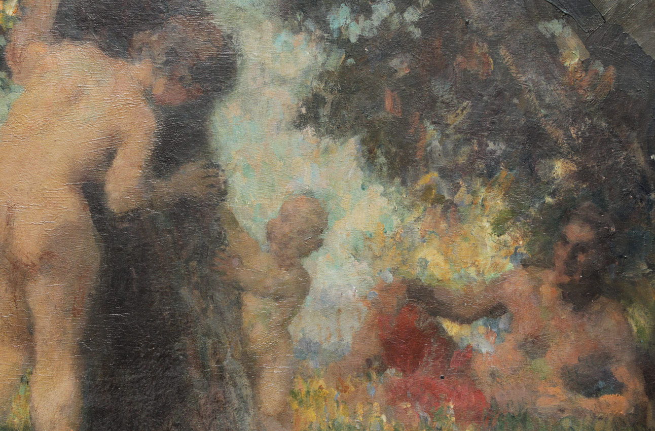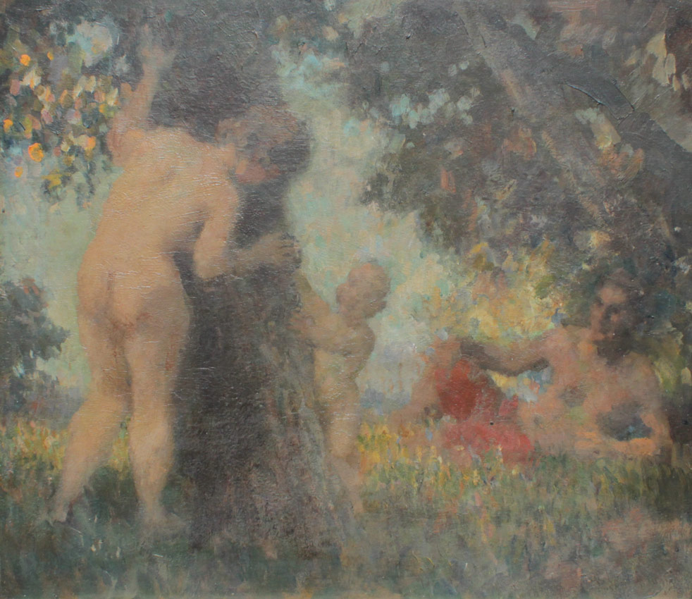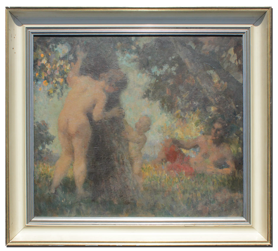 GOOD MYSTERY OIL/PANEL PAINTING: Depicts a game of hide and seek with Mother, Child and Male Onlooker, the sketch for this painting is on the other side, Oil/Panel, 18'' x 20 1/2'', no visible signature, framed 22 1/4'' x 24 3/4''.
