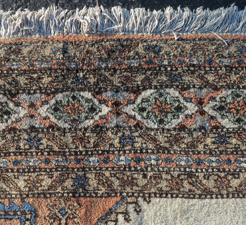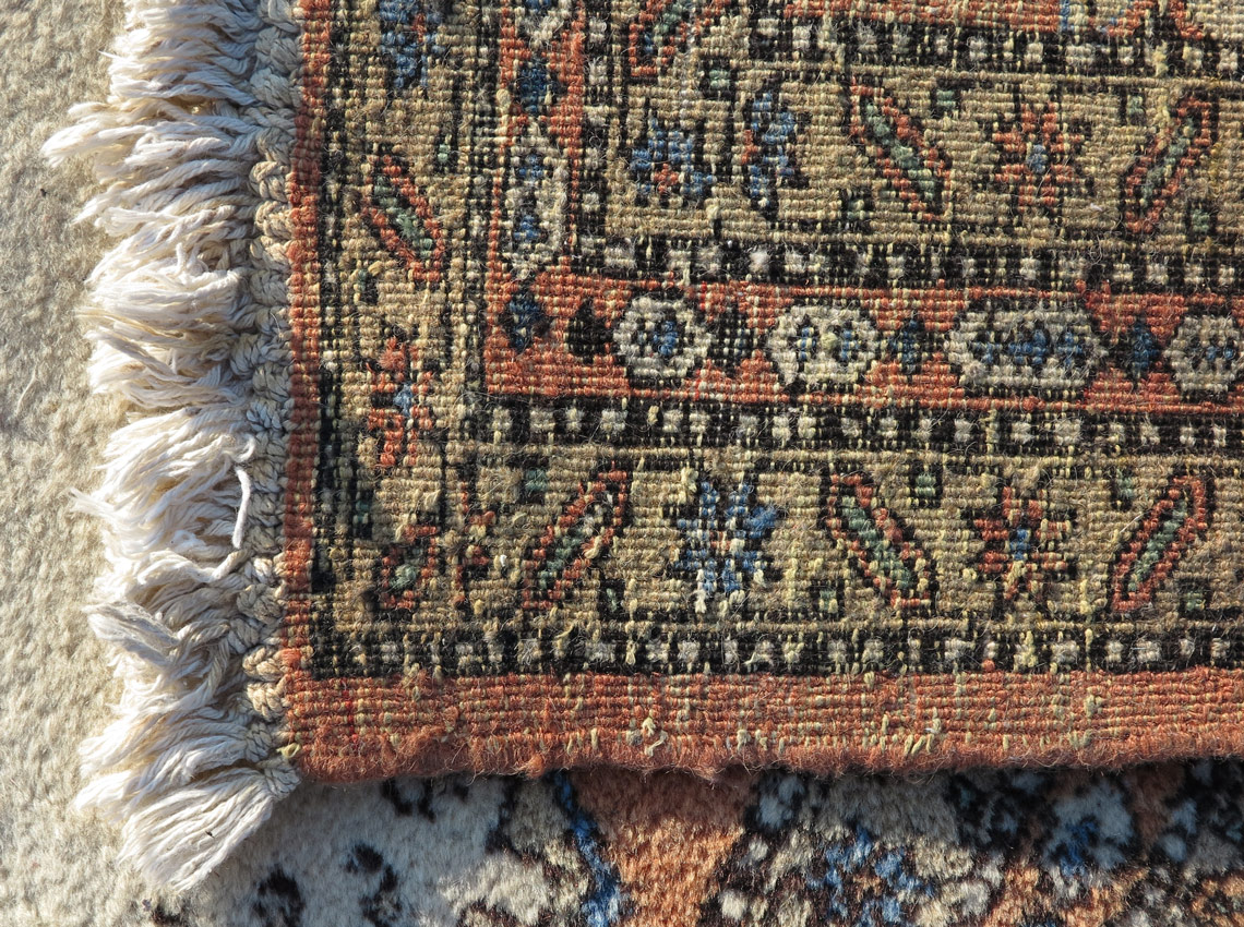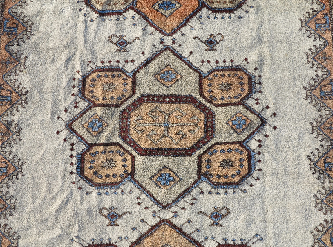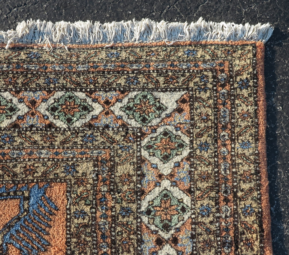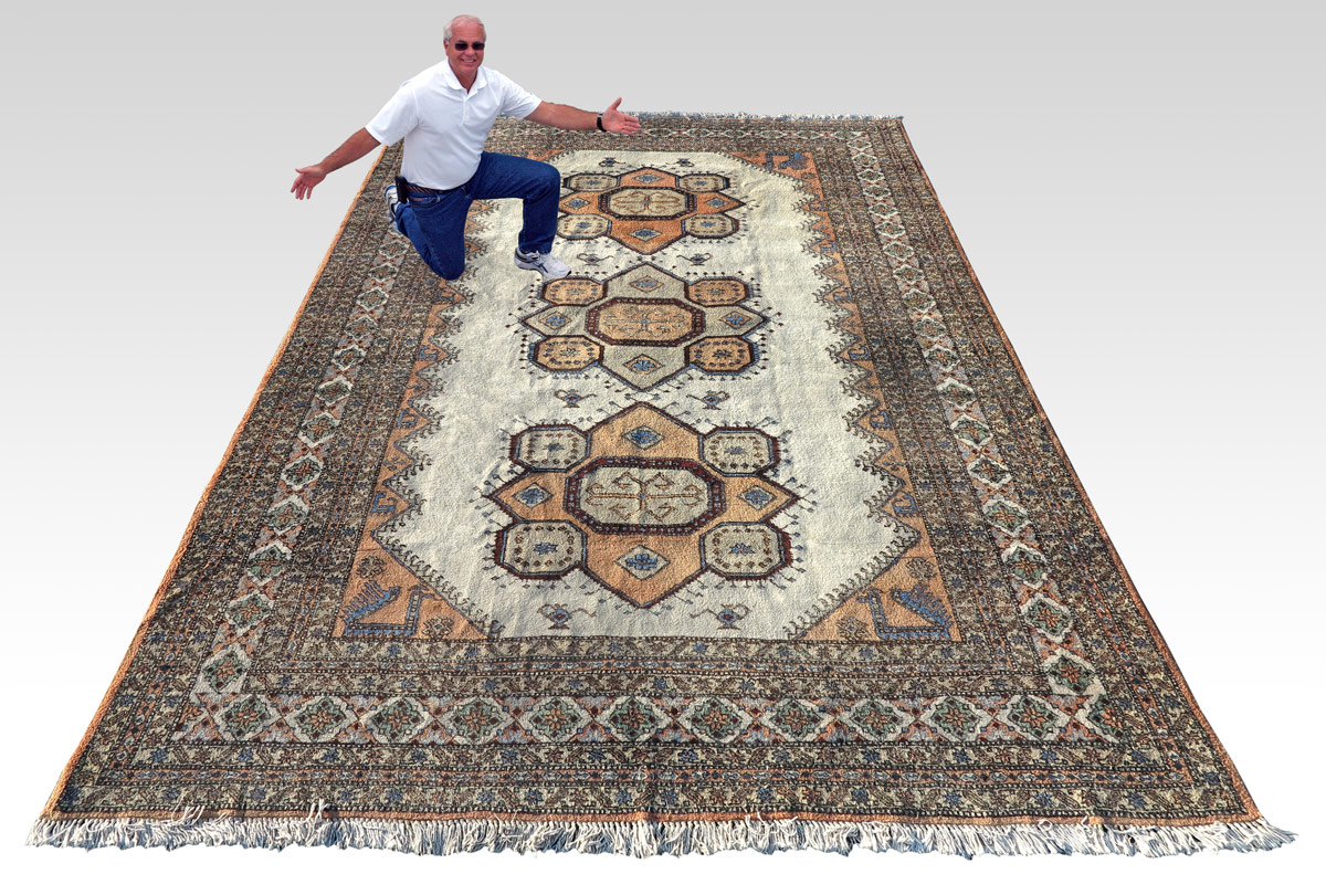 PAKISTANI PERSIAN HAND KNOTTED WOOL RUG, 9'3'' x 12': This pastel colored modern rug has a design of three medallions on a cream colored ground with peach colored sides and corners. In the corners and up the sides of the rug are found birds and animal figures done in pale blue. Another interesting element of the rug is the small pairs of lamps that are found on either end of each medallion. Condition is good.