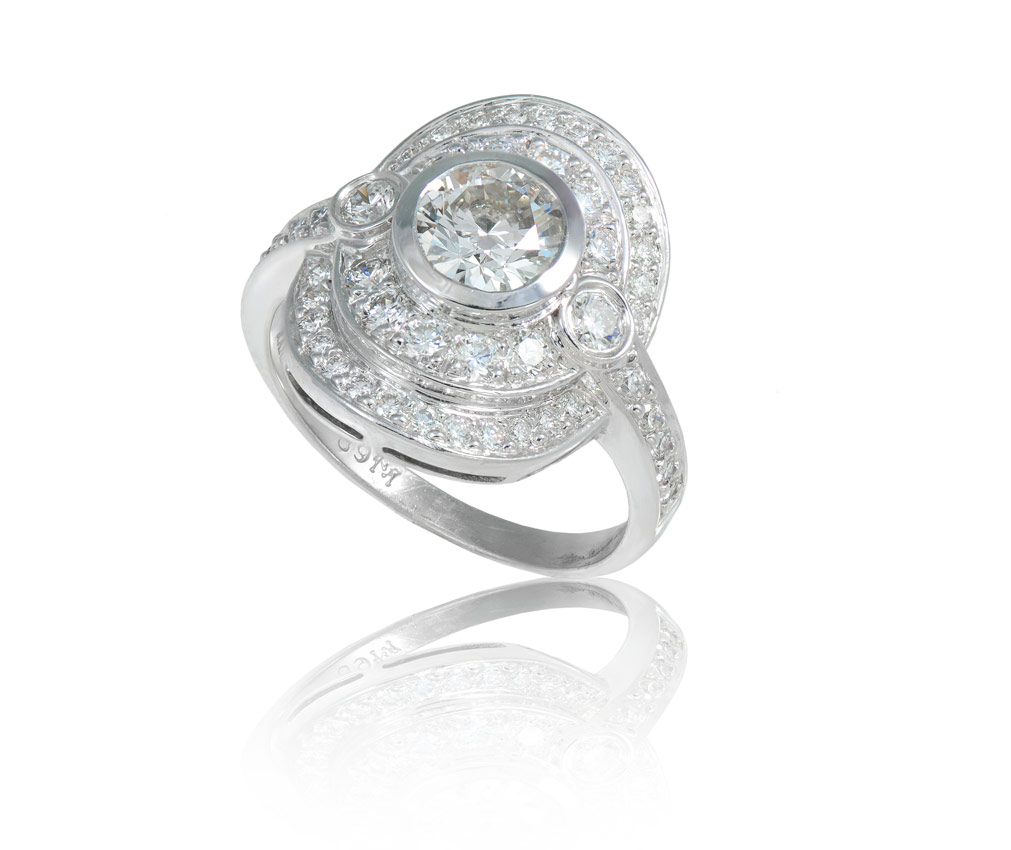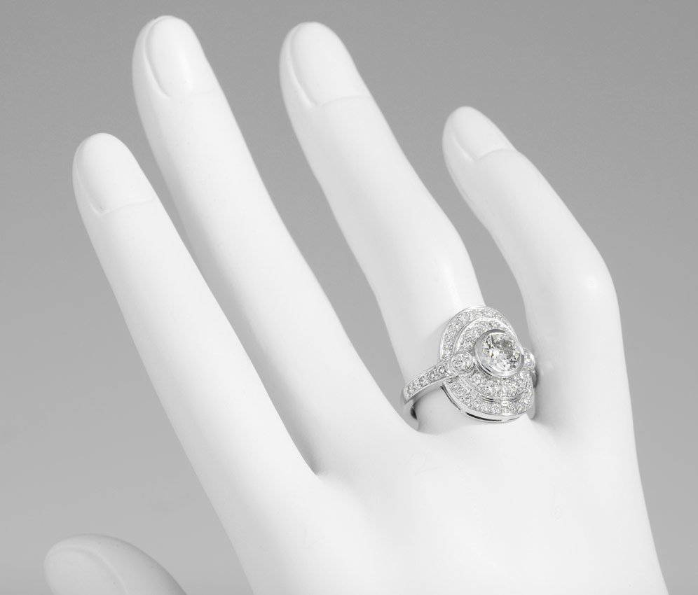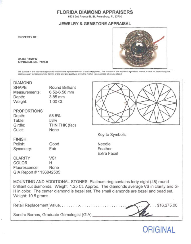 GIA CERTIFIED 1 CT DIAMOND RING WITH PAVE SURROUND: Platinum ring centers a 1.00 Ct round brilliant diamond, GIA report #1136842505. Rated VS1, color H. The mounting has and additional 48 round brilliant diamonds totaling approx. 1.25 Ct., averaging VS in clarity and G-H color. weight 10.5 grams. Sold with current Florida Diamond Appraisers GIA graduate appraisal for $16,275.