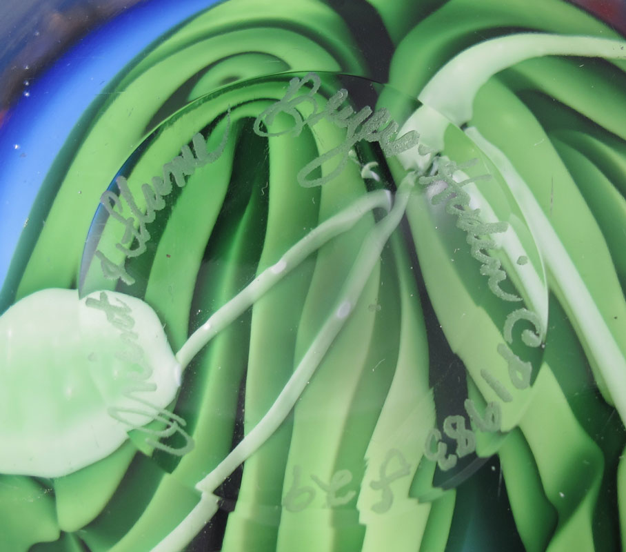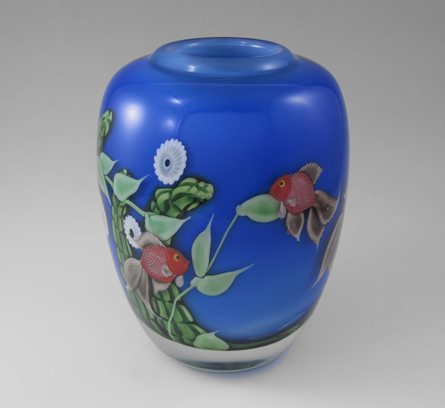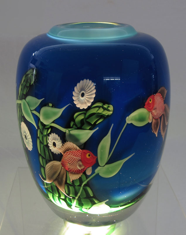 ORIENT AND FLUME GOLD FISH VASE: Paperweight vase in blue glass showing 5 goldfish swimming in the reeds. Glass artists Scott Beyer and L. Hadin. Signed ''Orient & Flume Beyer - Hadin CP 1983 F29. Measures 8 1/2'' tall.