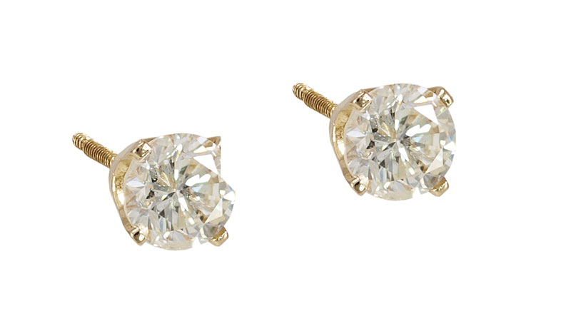 14K 1.10 CTW DIAMOND SOLITAIRE EARRINGS: 14K yellow gold diamond earrings contain 2 round brilliant cut diamonds. Weight: 1.10 Ct. Approx. Rated I1 in clarity and I-J in color. The diamonds are prong set. Threaded post and nut closures.