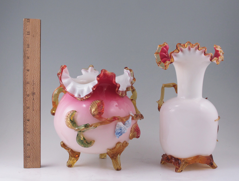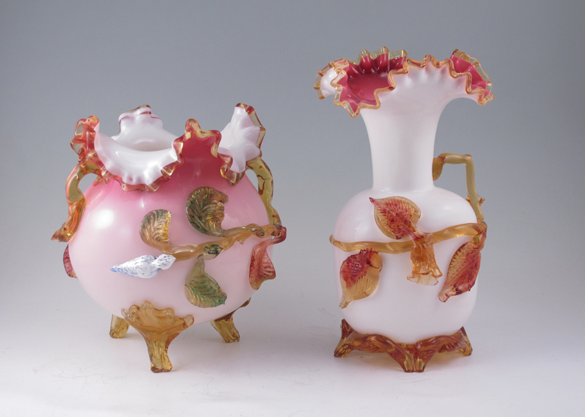 TWO STEPHENS AND WILLIAMS VASES: 1) High gloss, applied flower vine, 10 1/4'' tall. 2) Bulbous high gloss with applied flowering vine. 8'' tall, 7'' dia.
