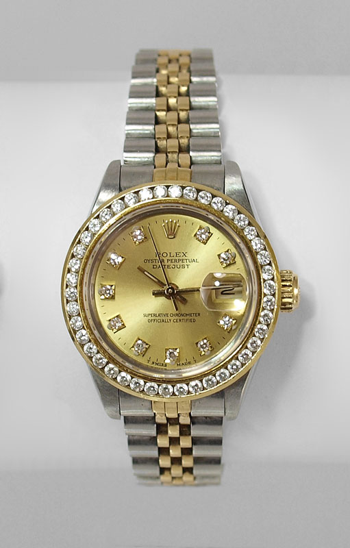 LADIES 18K ROLEX DIAMOND BEZEL WRISTWATCH CA. 1995: Two tone 18K yellow gold and stainless oyster perpetual ladies watch. 31 jewel Swiss 2135 ladies Rolex movement in good working order. Champagne diamond dial with diamond markers and stick hands. Sold with the extra gold bezel.