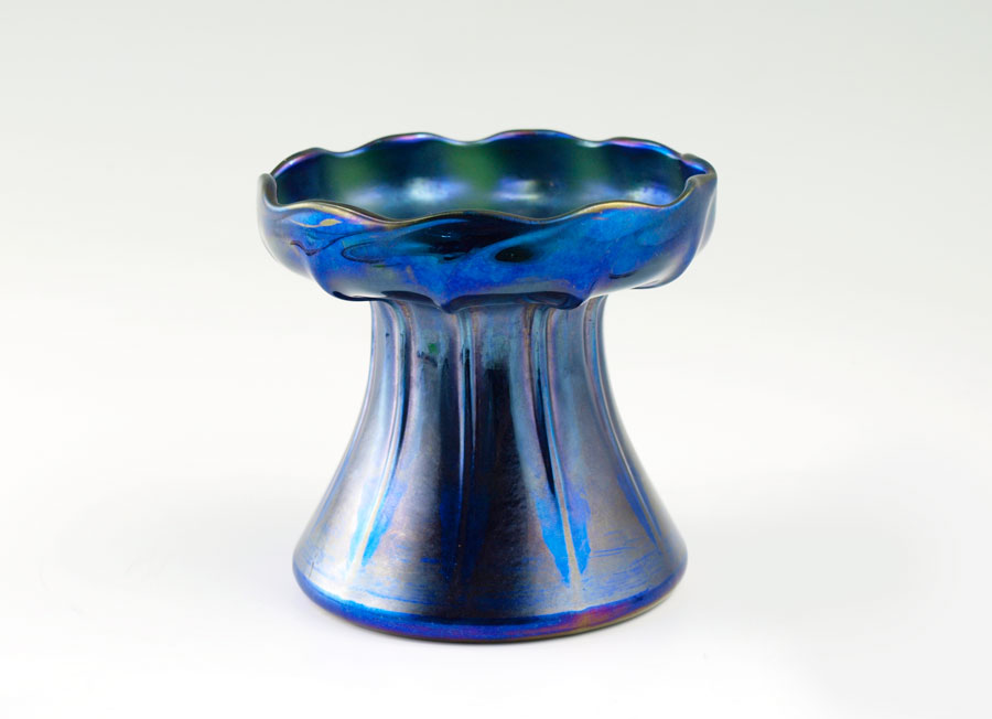 TIFFANY FAVRILE FLORIFORM ART GLASS VASE. Overall blue iridescence, inscribed L.C. Tiffany Favrile 1026. Paper label. 4''h., 4.25'' dia. at the rim.
