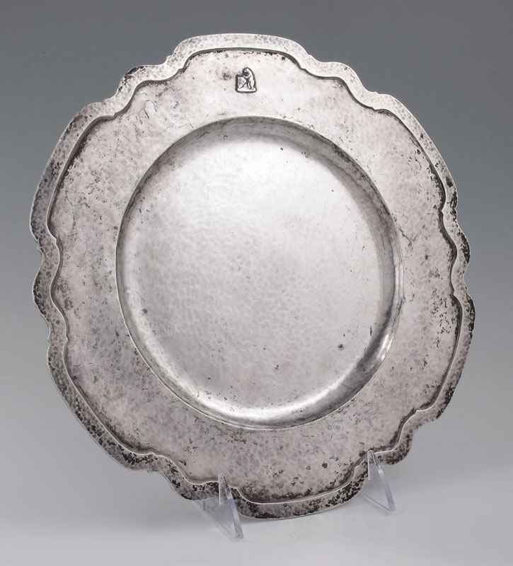 SHREVE & CO STERLING CALIFORNIA EXECUTIVE MANSION PLATE: Arts & crafts hand hammered sterling plate with embossed figure of the California bear and shield reading CAL 1919. Back of plate marked Shreve & Co. Sterling San Francisco, Executive Mansion, 3648. 11 1/8''. Approx. 14.6 troy oz.