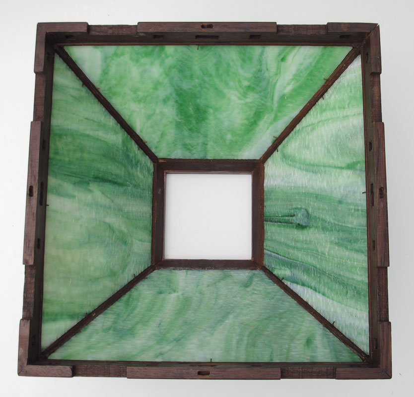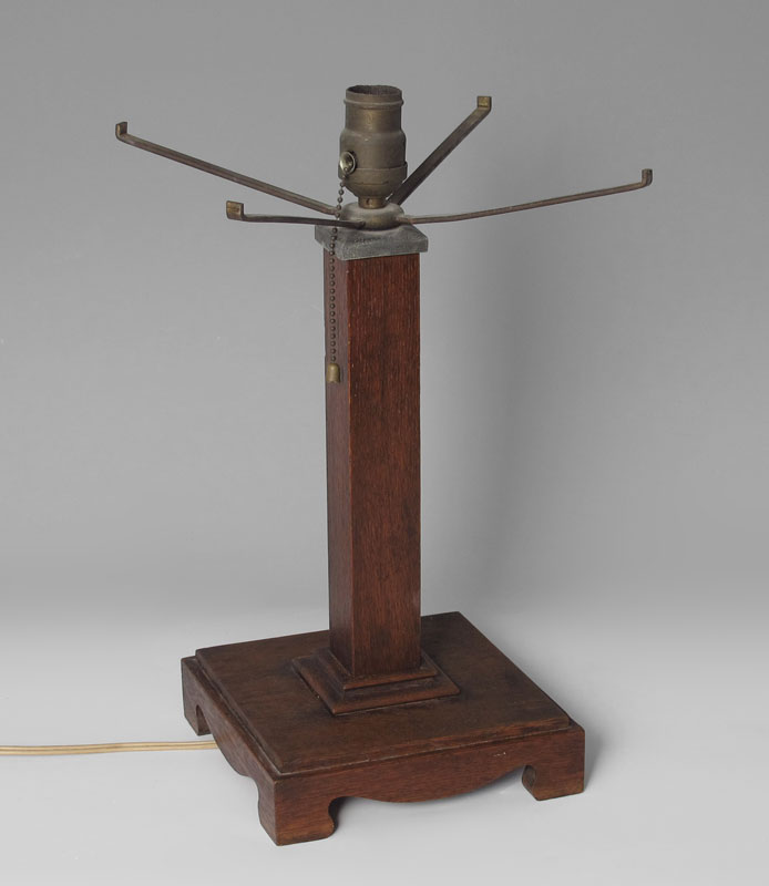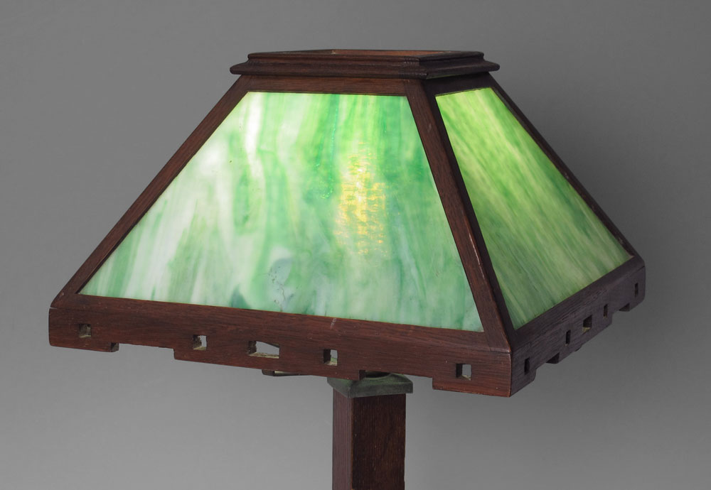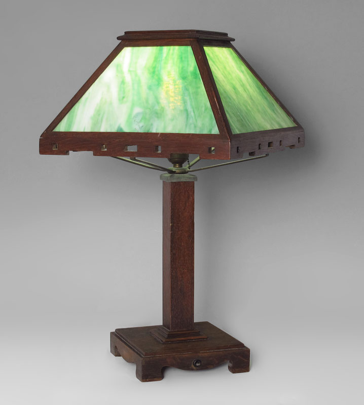 ARTS & CRAFTS OAK LAMP: Oak trim and base, metal supports to four green slag glass panel shade. Overall 22'' h. x 7 1/2'' square base dia. Shade 8 1/2'' h. x 13 1/2'' square.