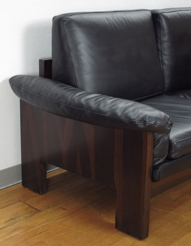 MILO BAUGHMAN ROSEWOOD AND BLACK LEATHER SOFA: Rosewood back, sides and skirt with black leather cushions. 26'' h. x 97'' x 34 1/2''.