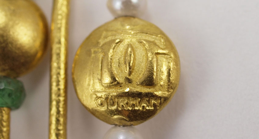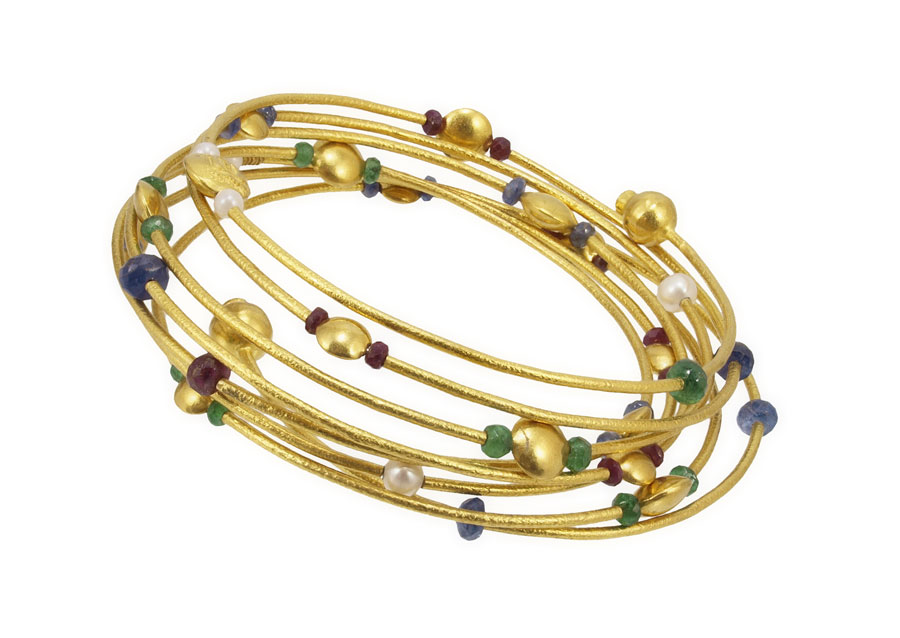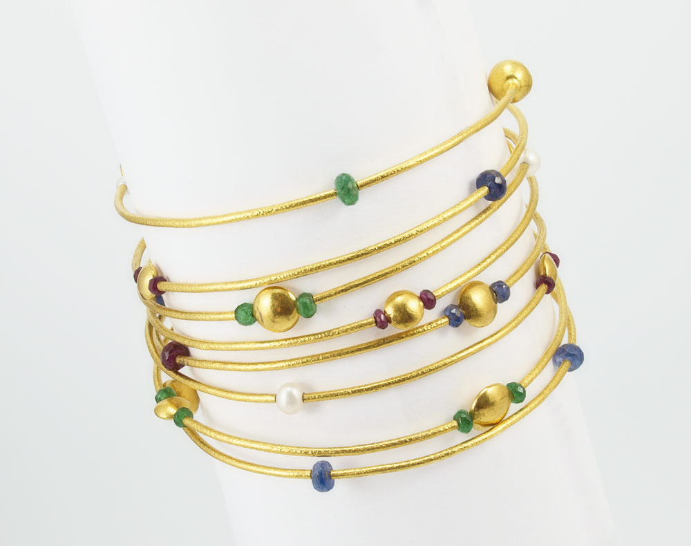24K GEMSTONE WRAP BANGLE BRACELET: 24K yellow gold spiral bangle bracelet with natural faceted bead gemstones including sapphire, ruby, emerald and cultured pearl. Weight: 25.7
