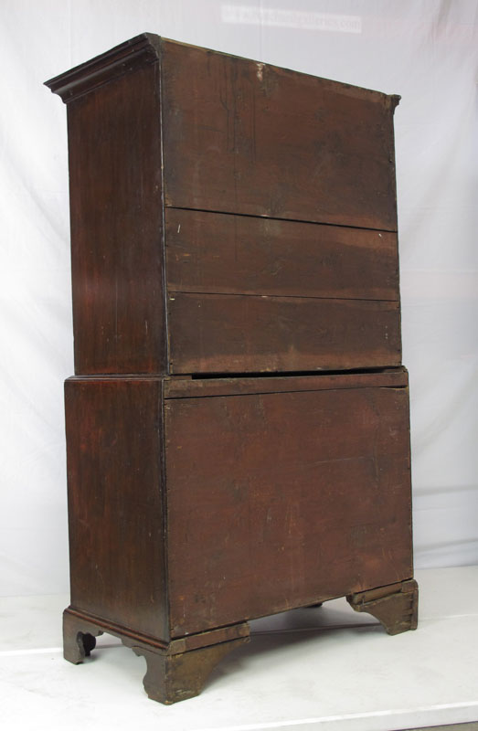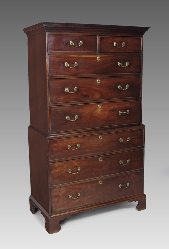 GEORGE III PERIOD MAHOGANY CHEST ON CHEST: Top section with 2 half drawers over 3 full length drawers, lower chest with 3 full length drawers, on bracket feet. Original brass hardware. 69 1/2'' h. x 39 1/2'' x 20''.