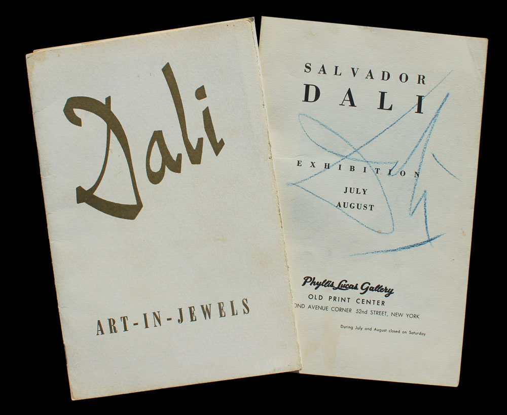 DALI, Salvador, (Spanish, 1904-1989): Autograph on Phyllis Lucas Gallery July/August Exhibition Catalog, 1965, 8 1/2'' x 5 1/2'', signed on the front in blue pencil, and on a photo image inside in pencil, sold with a Dali ART-IN-JEWELS catalog.