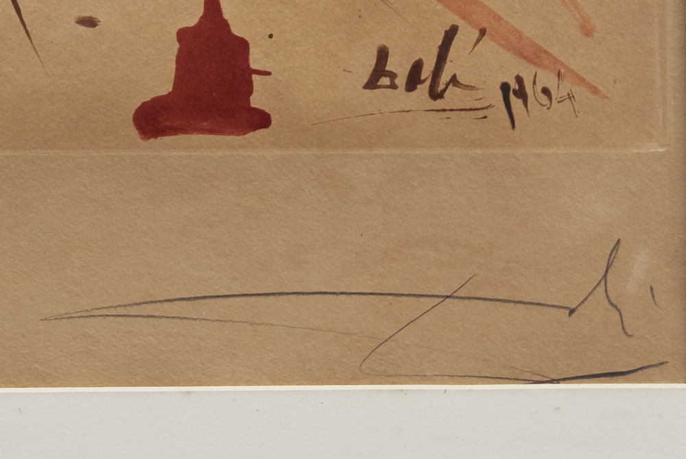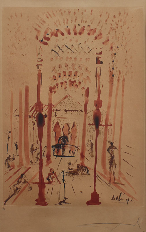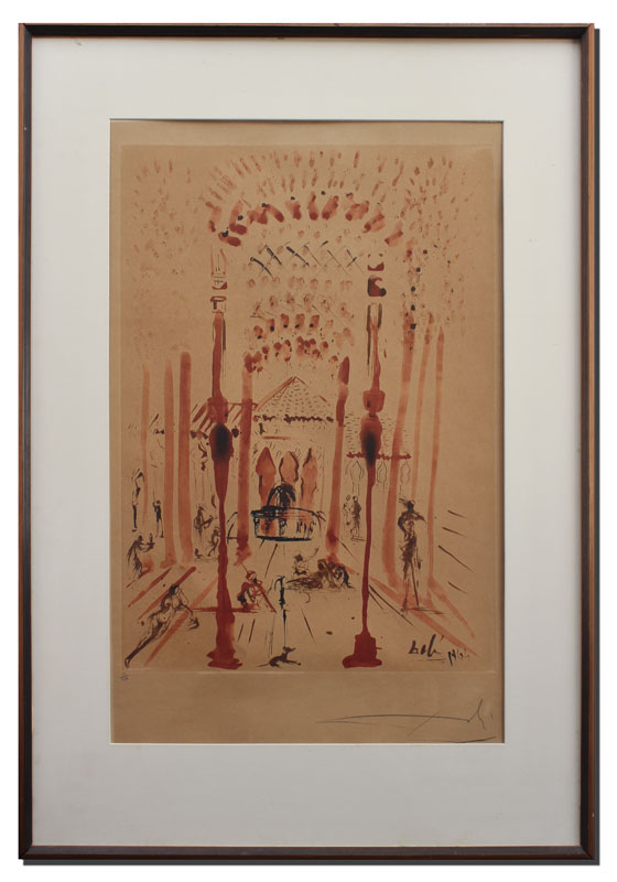 DALI, Salvador, (Spanish, 1904-1989): ''Alhambra'', Etching in Color, sight size 27 1/2'' x 18 1/2'', signed lower right, numbered 44 of 150, signed in the plate, dated 1964, framed, 37 1/2'' x 27 1/4''. Gallery 121 original receipt affixed verso from 1966.