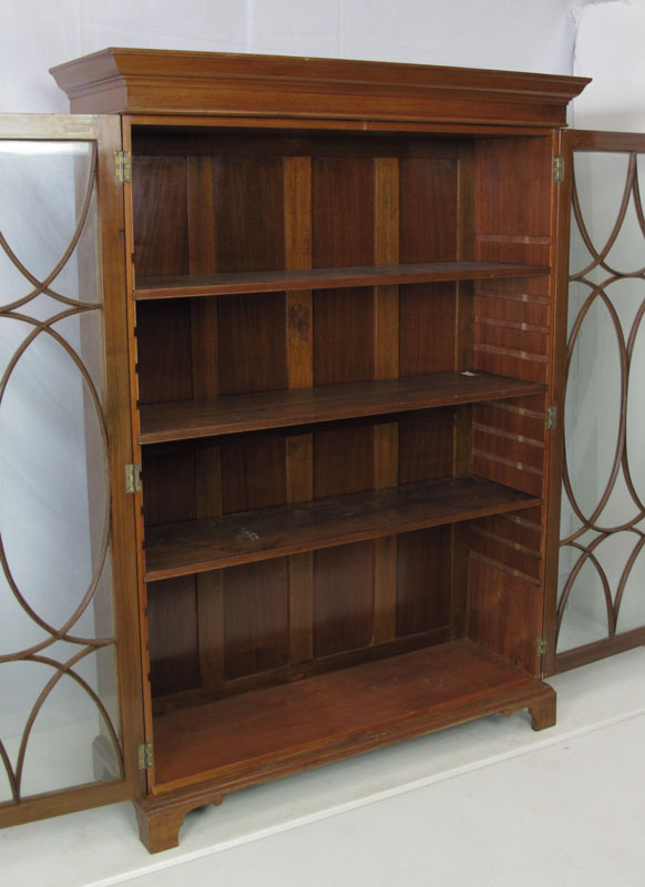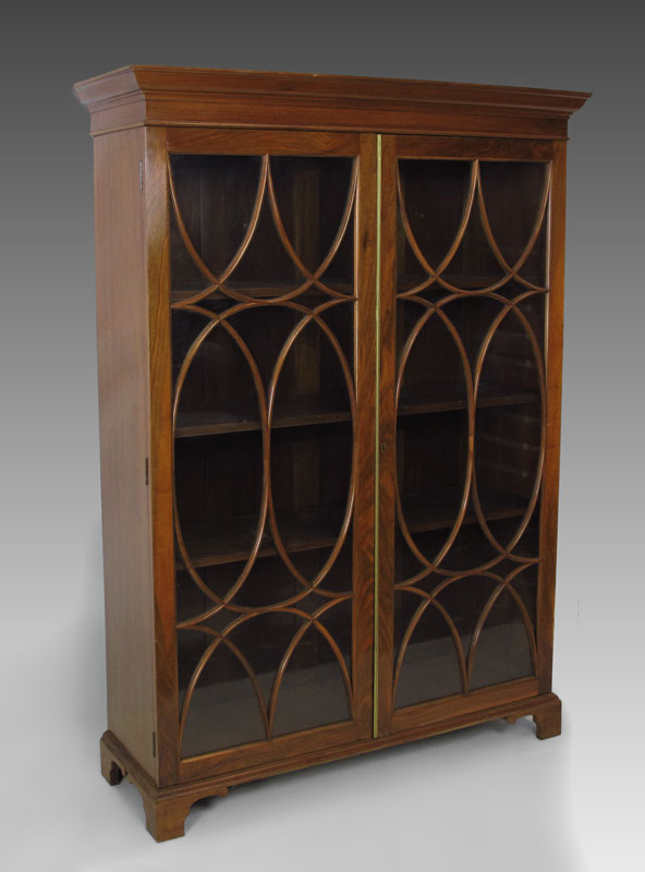 ENGLISH WALNUT 2 DOOR BOOKCASE CA. 1880'S: Classic astragal glass doors, 3 replacement shelves, bracket feet. 73'' h. x 52'' x 17''.