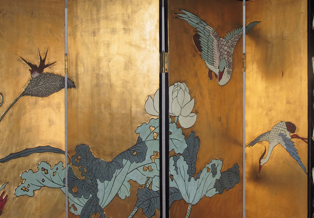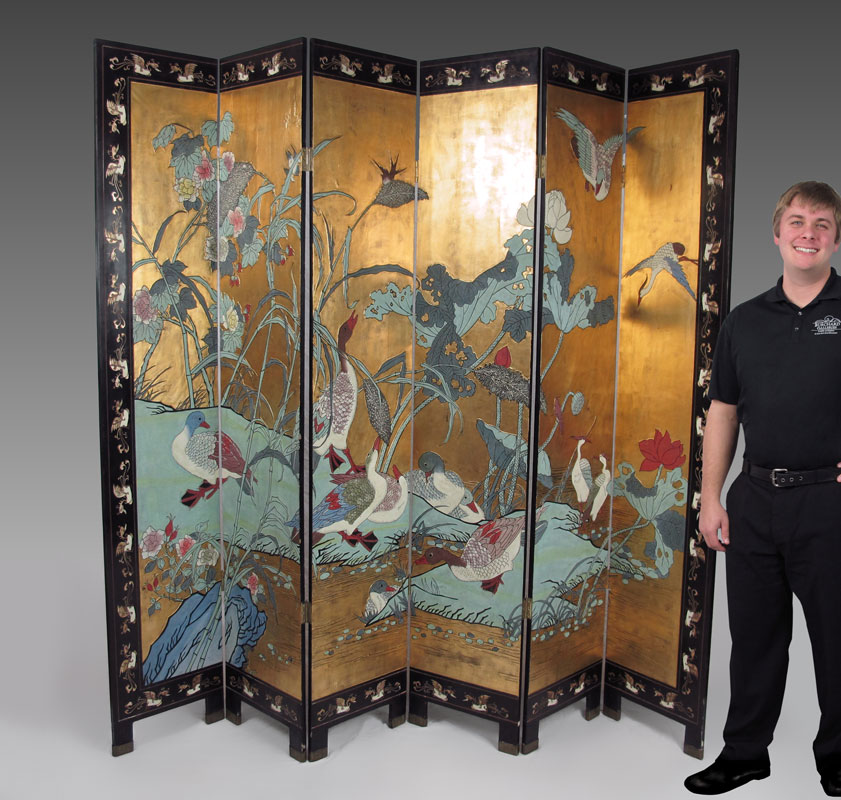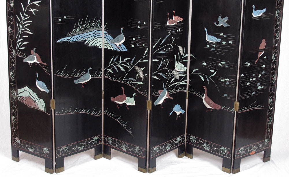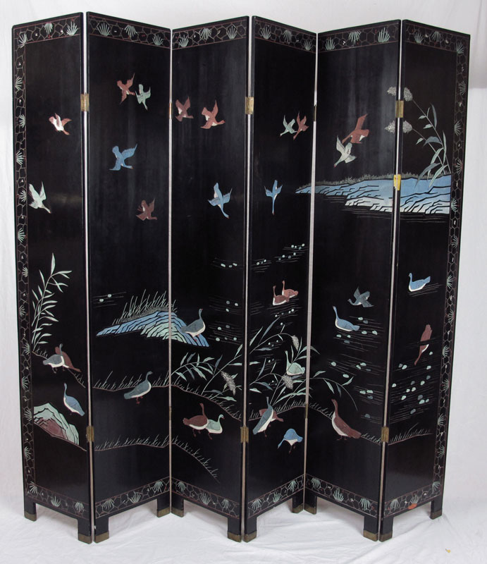 6 PANEL COROMANDEL SCREEN: Birds and floral motif on both sides, one side with gilt accents, other black lacquer. Signed ''Lacquer Furniture Shanghai China''. Each panel 84 1/2'' h. x 16''