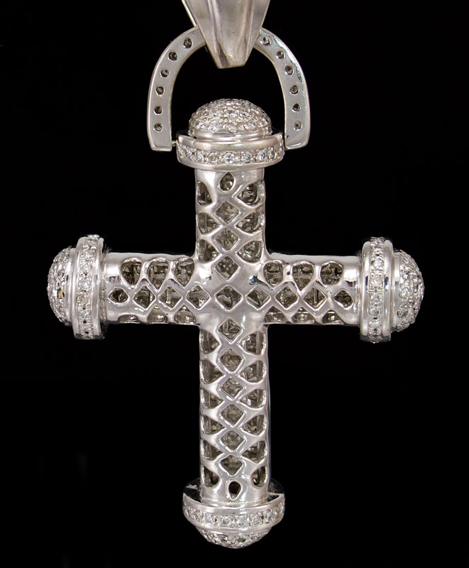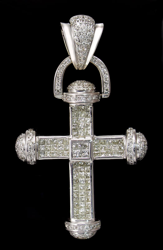 AN IMPRESSIVE 10.5 CTW DIAMOND CROSS PENDANT: 18K white gold cross pendant of 250 round brilliant diamonds (one missing) and 79 square brilliant cut diamonds all totaling approx. 10.50 Ct. Average SI in clarity and H-K in color. Pave and invisible set. Length 3''. Weight 45.3 grams. Sold with current Florida Diamond Appraisers GIA graduates appraisal for $18,000.