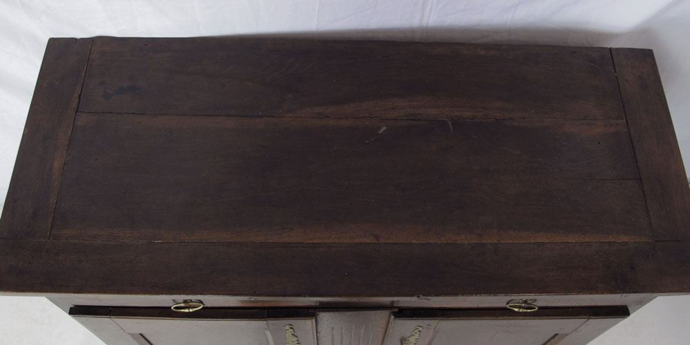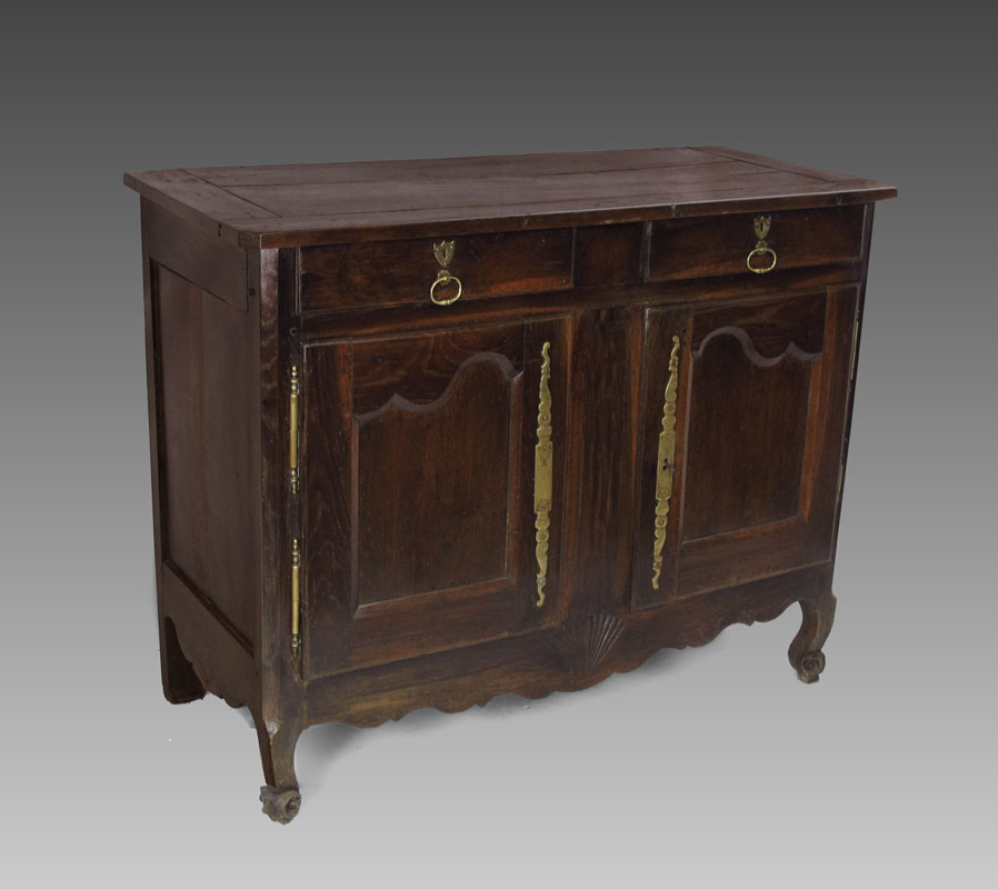 FRENCH OAK BUFFET: 2 drawer over 2 doors with brass hardware. Carved shell on shaped skirt, carved and shaped front legs. 38 1/2'' h. x 50'' x 21 1/4''.