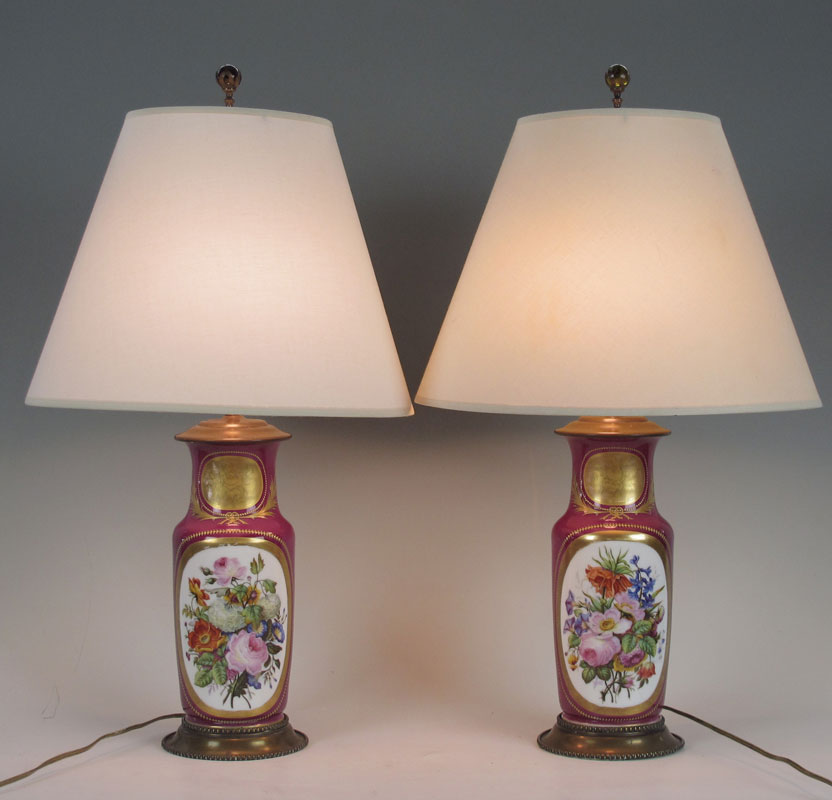PAIR OLD PARIS PORCELAIN LAMPS: Hand painted floral design, each unique from the other. Porcelain measures 12:, the lamps are 27'' overall.