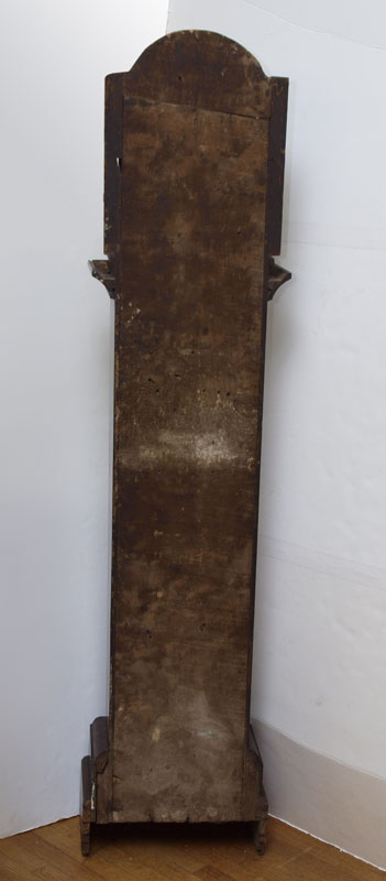 RICHARD FRANCIS ENGLISH OAK LONGCASE CLOCK: Circa late 18th to early 19th century English oak longcase clock by well known clock maker Richard Francis of Attelburgh. Carved and shaped pediment with 3/4 columns on bonnet. Hand painted metal dial with Roman and Arabic numerals, secondary dial and date. Marked on face Rich.d Francis Attelburgh. Measures 82'' h. x 18 1/2'' x 9 1/2.