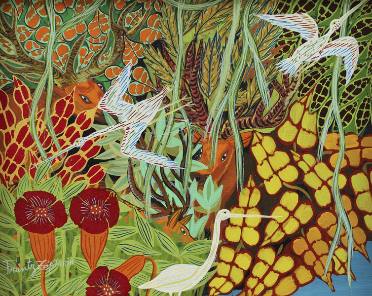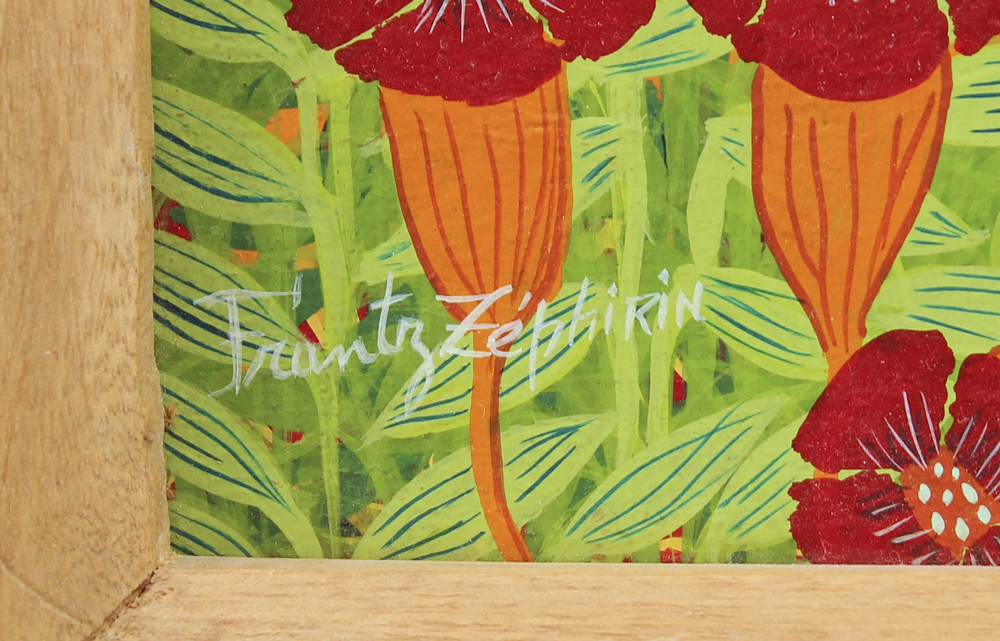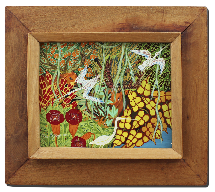ZEPHIRIN, Frantz, (Haitian, 20th C.): Haitian Jungle Scene with Animals and Birds, Oil/Masonite, 8'' x 10'', signed lower left, original wood frame, 13'' x 14 1/2''.