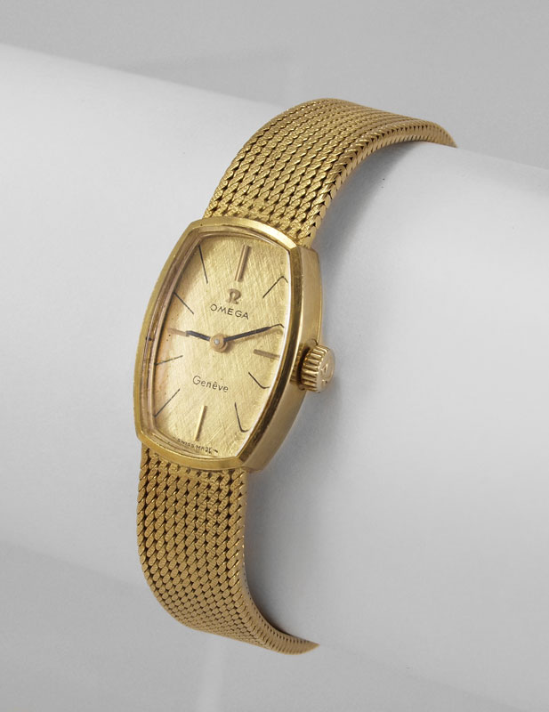 18K LADIES YELLOW GOLD OMEGA DRESS WATCH: Ca.1990. 18k yellow gold case and integrated Florentine mesh band with ladder style extension. Swiss 17 jewel mechanical movement. champagne dial with stick markers and stick hand, Serial number B43807. Model 8221. Length 6 3/4''. Weight: approx. 33.7 grams.