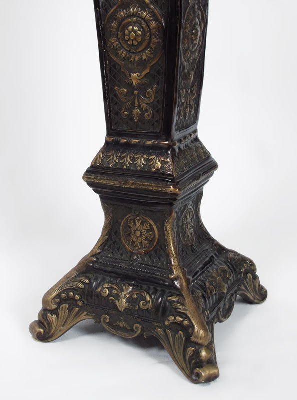 PATINATED BRASS PEDESTAL: Embossed Aesthetic movement design, 34'' tall, the top is 10'' square.