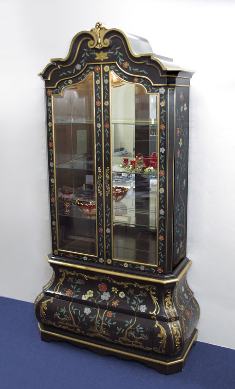 WIDDICOMB BOMBAY SHAPED PAINT DECORATED CABINET: Floral motif with gilt accents. Upper part with illuminated mirrored back interior with glass shelves, beveled glass doors. Bombay lower section with two drawers. Name plate in drawer. Approx. 84'' h. x 44'' x 17 3/4''.