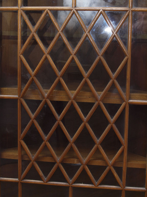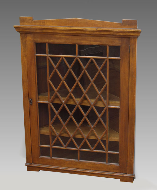 FRETTED WALL HANGING CORNER CABINET: 2 internal shelves. 36 1/2'' h. x 27 1/4'' x 14 3/4''.