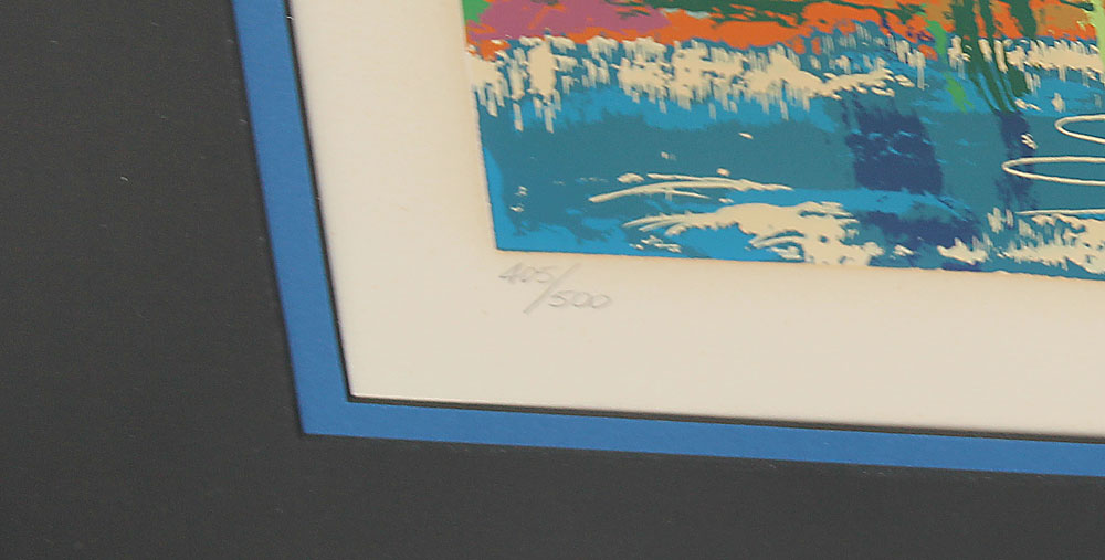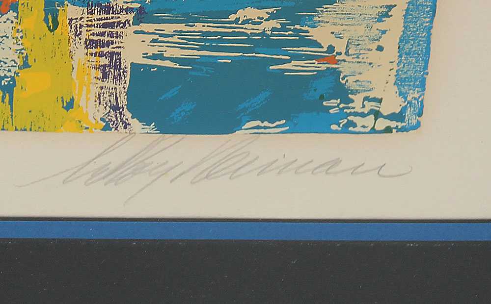 CONDITION: The print has full margins, and is hinge mounted; the bad news, several small spots where the serigraph stuck to the plexiglass, and a crescent shaped spot less than 1/8''. All the ink that is not on the print is adhered to the plexi. It does have a faint brown tint in the area exposed to light, and there is some vertical cracking, but no separation.