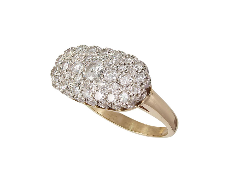 DIAMOND CLUSTER RING: 14K yellow gold ring with an oval cluster of 29 diamonds, 3 are round brilliant and the remainder are round single cut diamonds. Total diamond weight is approx. 1.10 Ct. Average VS-SI in clarity and H-I in color. Prong set. Weight 6 grams. Sold with current Florida Diamond Appraisers GIA graduates appraisal for $2250.