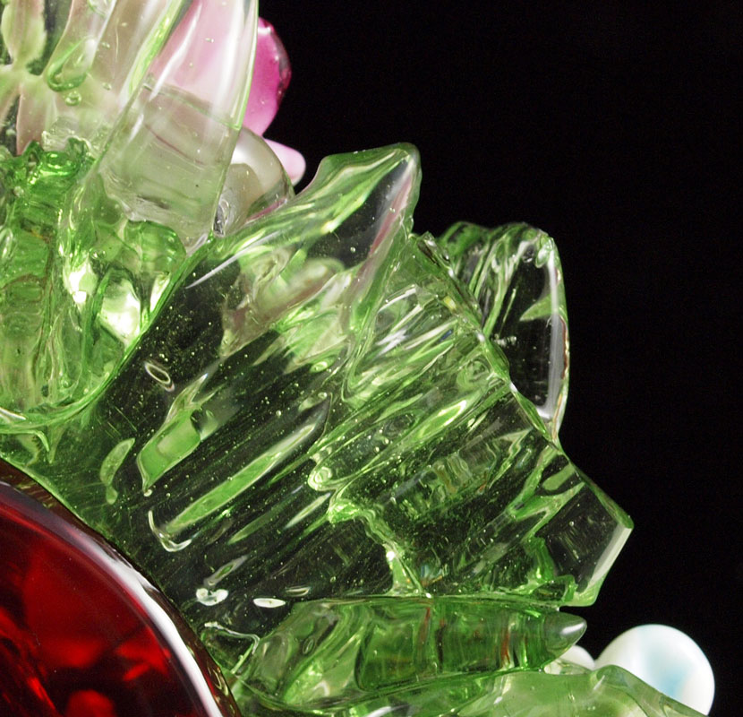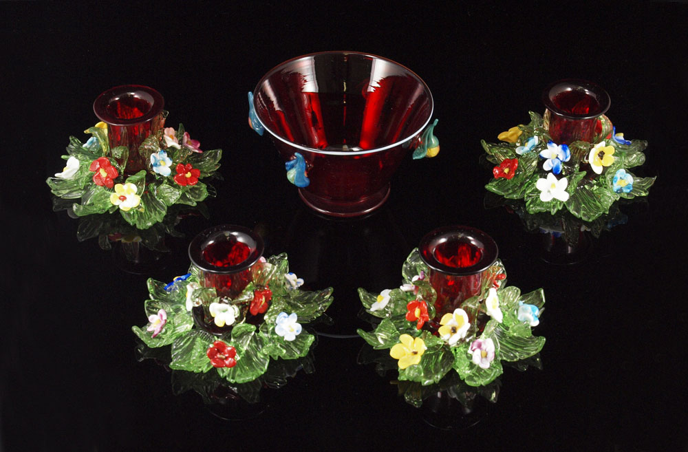 VENETIAN ART GLASS RUBY BOWL AND CANDLE HOLDERS: Ruby red glass bowl with applied fruit., 3''h. x 4 2/5'' dia. Sold together with a set of 4 candle holders with applied flowers. 2.75'' t. x 4 1/2'' dia.