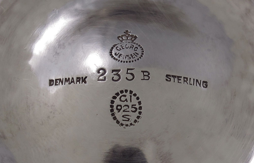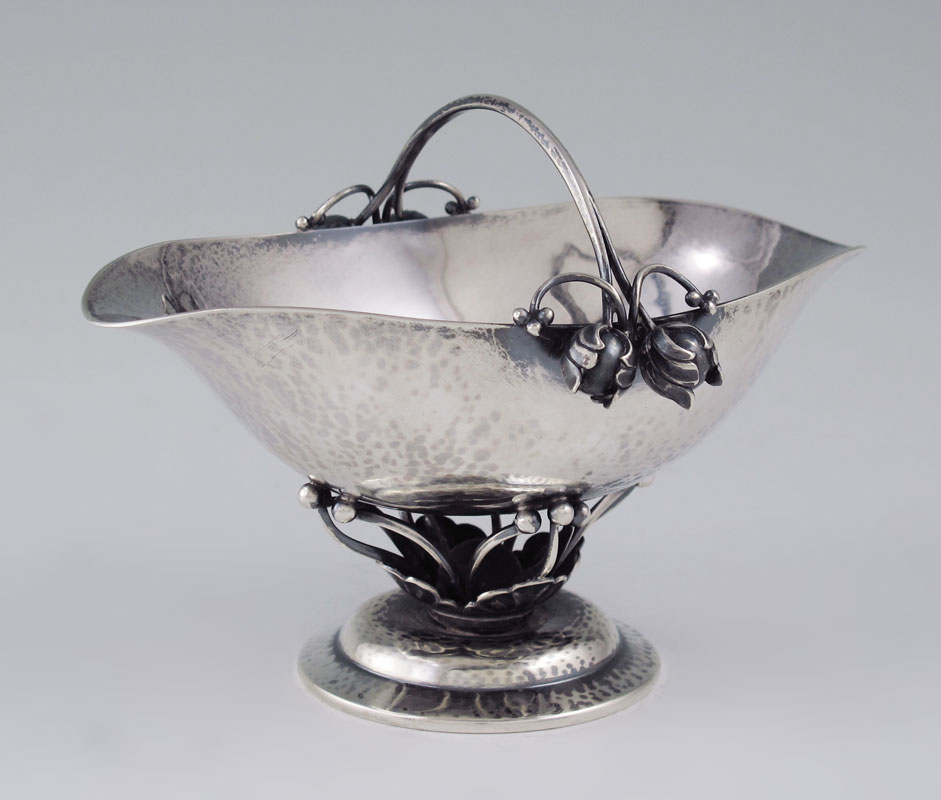 GEORG JENSEN STERLING SUGAR BASKET: Circa 1925-1931. Designed by Georg Jensen. Floral motif handle and base. Marked Georg Jensen Denmark Sterling 235B. Approx. 5.8 troy oz.