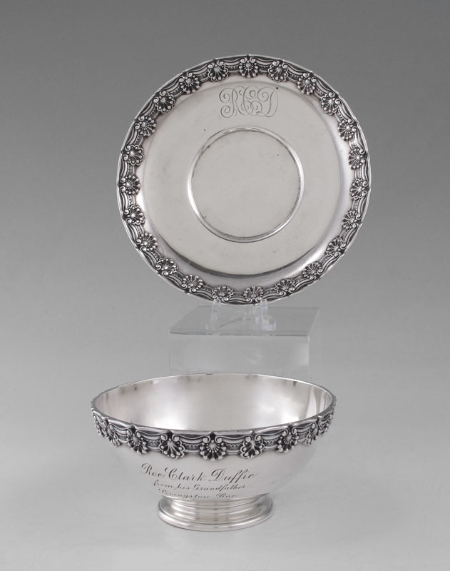 TIFFANY & CO. STERLING CHRISTENING BOWL AND UNDERPLATE: Bowl and underplate by Tiffany & Co. in the English King pattern. Engraved on bowl ''Roe Clark Duffie from his Grandfather Livingston Roe'' and on bottom ''Christened May 15 1898''. Underplate monogrammed RCD. Marked Tiffany & Co. 8173 9860 Sterling Silver T. Bowl 2 1/4'' h. x 4 3/4'' dia., underplate 5 3/4''. Approx. 9.3 troy oz.