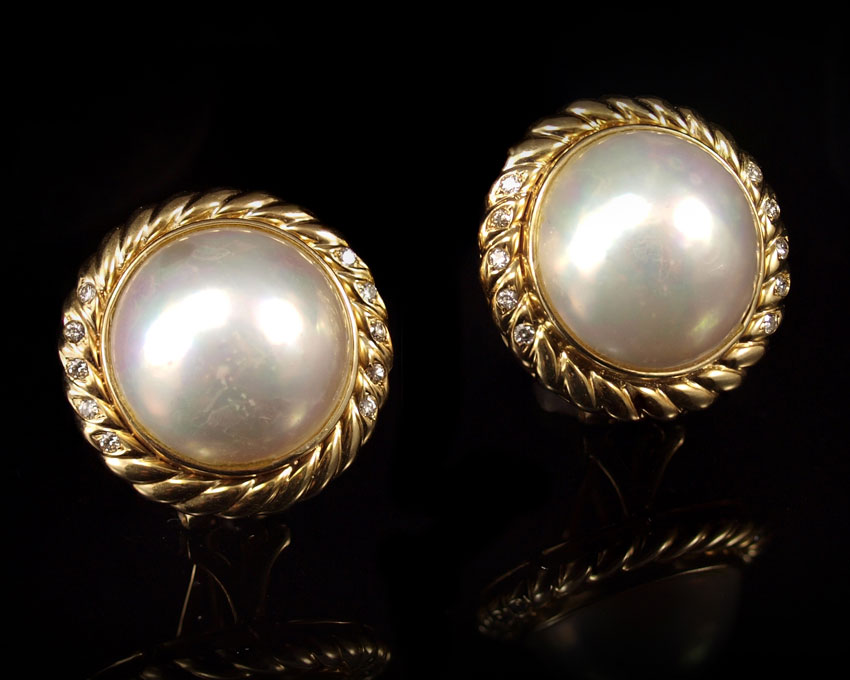 14K MABE PEARL & DIAMOND EARRINGS: 14K yellow gold earrings contain two 17.00 mm round cultured mabe pearls. White in color with pink overtone. High luster. 20 round brilliant cut diamonds. Weight: .33 Ct. Approx. Rated VS in clarity and G-H in color. The pearls are bezel set. The diamonds are deep set. Post and hinged clip closures. Gold weight: 8.0 grams approx