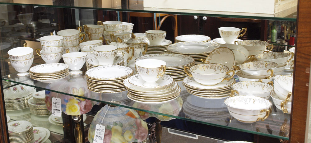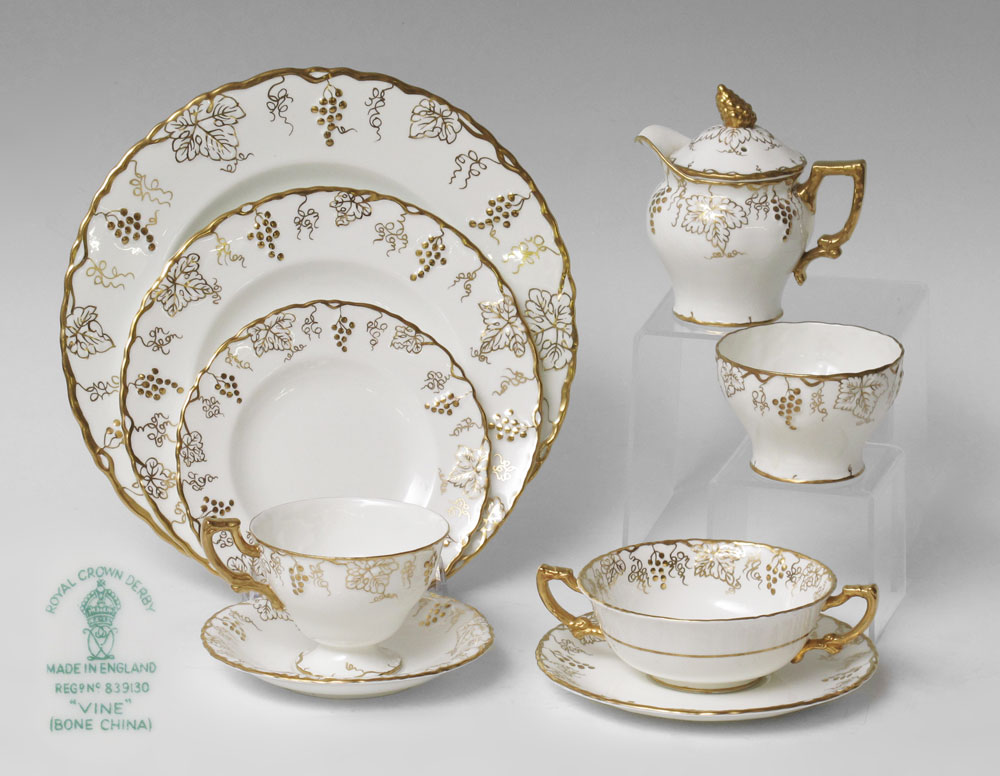 CROWN DERBY FINE CHINA SERVICE IN THE VINE PATTERN: Approx. 81 pieces to include 10 dinner plates (10 1/4''), 11 salad plates, 12 bread plates, 11 cream soup with 12 underplates, 12 cups and 13 saucers, sugar and covered creamer.