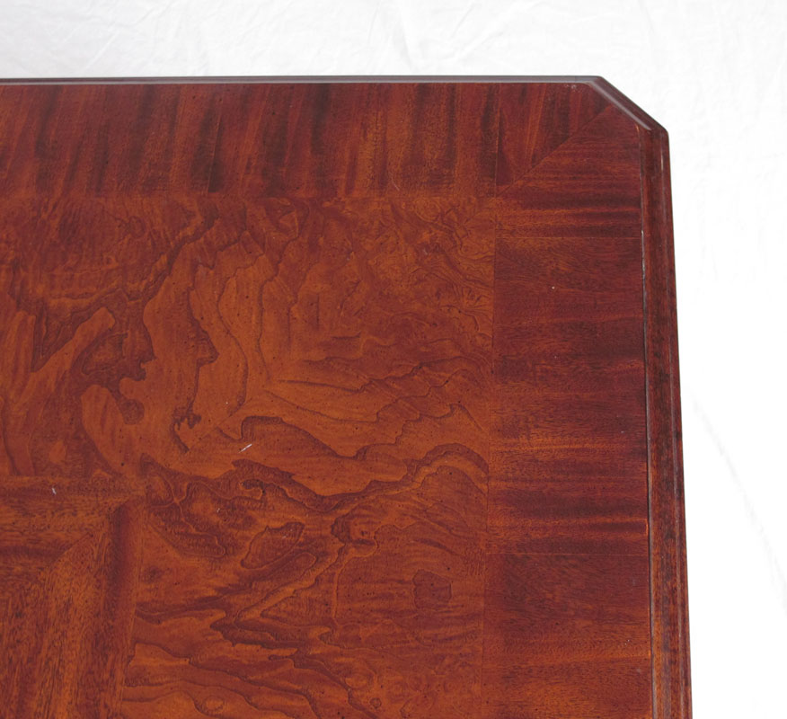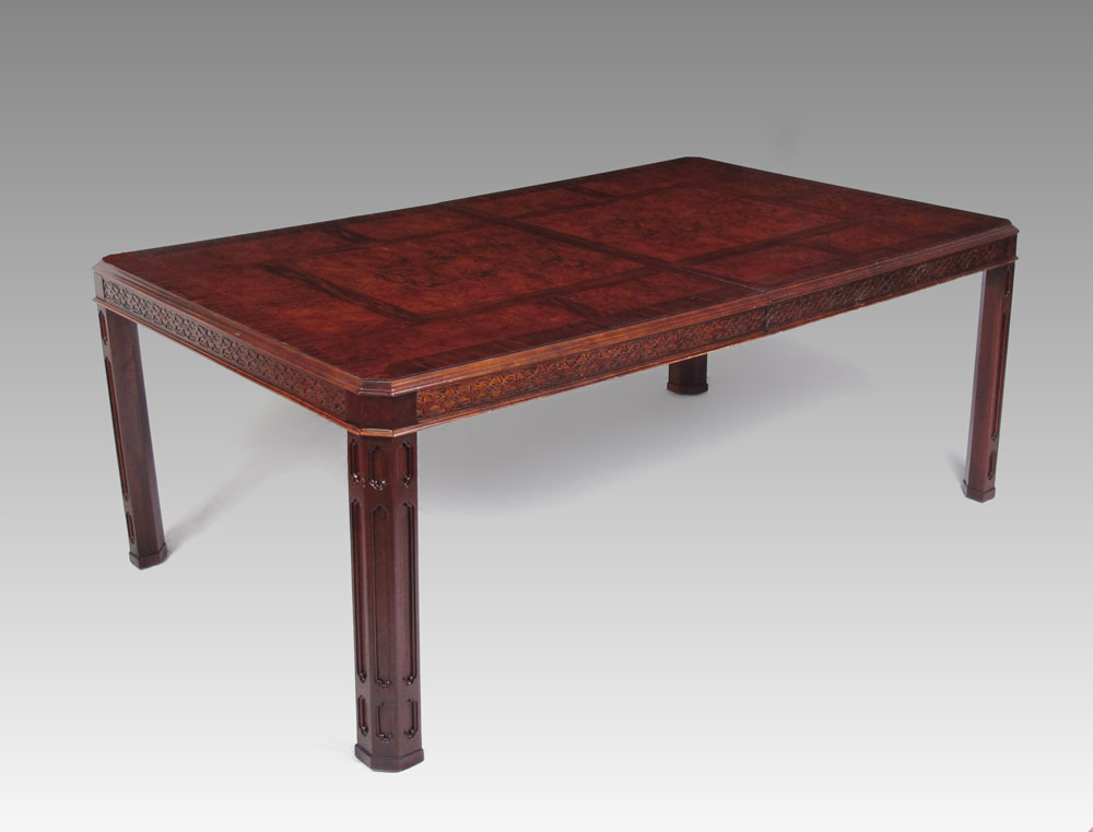 BURL WALNUT CHINESE CHIPPENDALE STYLE DINING TABLE: And three leaves, large enough a banquet. Relief design on the apron and legs. Approx. 29'' h. x 75'' x 46''. Each leaf measures 20'' which will expand the table to 135''L.