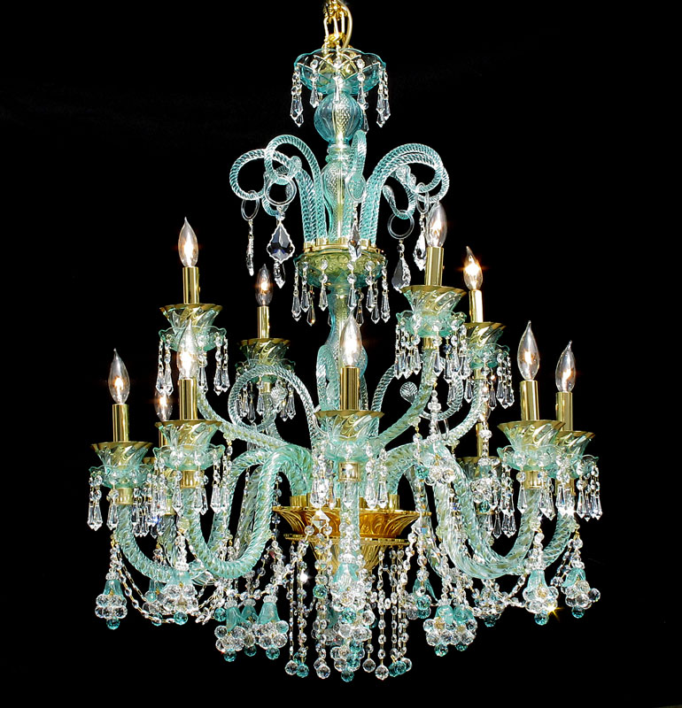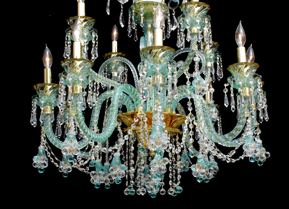 CONTEMPORARY VENETIAN GLASS 12 LIGHT CHANDELIER: Italian import by Cristalbronz. Aqua-green glass, crystal chains, drop prisms and grape clusters. 42 1/2'' h. x 29''.