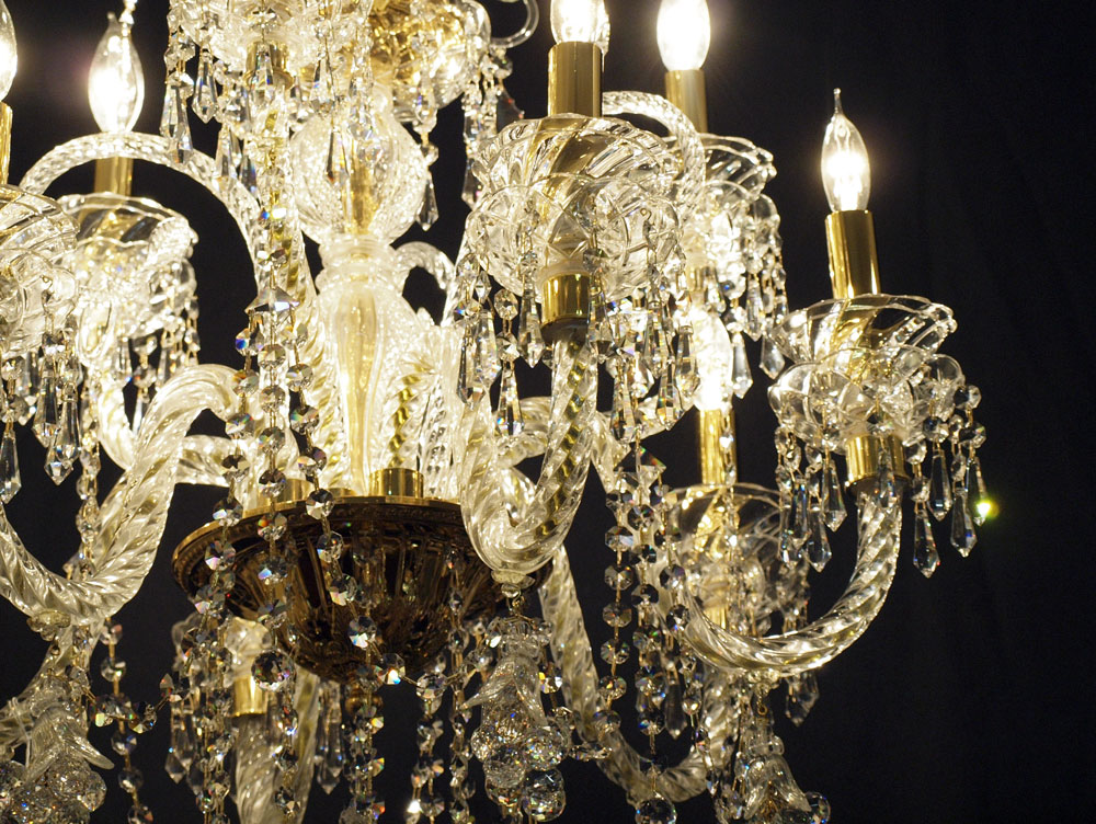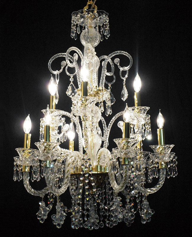 CONTEMPORARY VENETIAN GLASS 12 LIGHT CHANDELIER: Italian import by Cristalbronz. Clear glass, crystal chains, drop prisms and grape clusters. 37'' h. x 26'' dia.